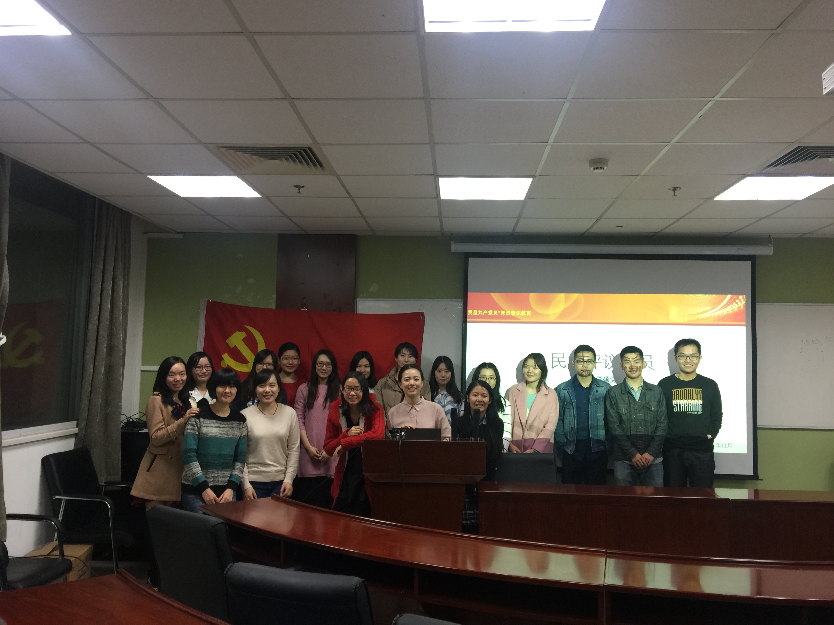 11月12日,2014级学硕党支部在后主楼1426进行了本年度的党员民主评议工作,旨在树先进、立先锋,加强党员的教育、管理和监督、提高党员素质、增强党组织的凝聚力和战斗力。 首先,党支书俞晨怡带领党员回顾了本支部上一学年的活动内容和工作成绩。总体而言,本支部党员在活动参与和理论学习方面都表现出色,取得了先进党支部、优秀党日活动等表彰。随后,各位党员各自陈述了自己这一年的在党支部的表现和进步,发表了自己的感想和对未来努力的方向。 根据上学年的学时情况和各位同学的相互推荐,通过自评、他评的方式,姬玲玲、赵琪、赵英3位同学因表现优异,被评为2014级学硕党支部优秀先进个人,另有戴莉等10位同学受到支部内表扬。党支书向他们颁发了奖品以兹鼓励。 党员同志们纷纷表示,会在新的一学年里继续努力,严格要求自己,以先进党员为榜样,加强理论和政策学习,积极参与各级各类党建活动。