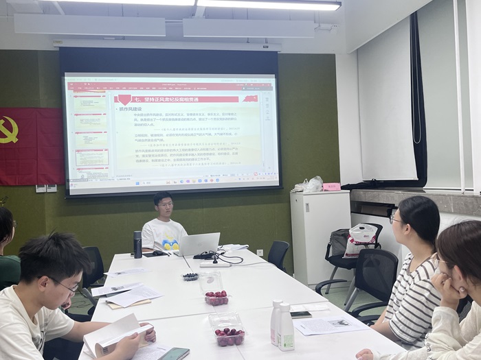 2025年6月25日晚,金牌影院 本科生第一党支部第三党小组在金丰和308会议室,以线上线下相结合的方式顺利举行6月份的党小组会,主题是“材料学习”。会议由梁彻同志主持,共9名成员参与。 会议伊始,全体同志奏唱国际歌。 随后,丁蓝同志线上领学《习近平关于加强党的作风建设论述摘编》第7—9章,结合实际案例详细讲述了为何以及如何坚持正风肃纪反腐相贯通;概括提炼了总书记关于净化党内风气,推动社风民风向上向善的要求和指导意见。梁彻同志从党风和社风民风关系的角度作了回应,强调党员干部既是中国人民的先锋模范,又是社会中的一员,党风社风民风息息相关,营造良善社风与淳朴民风离不开纯洁党风。