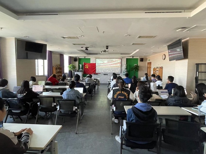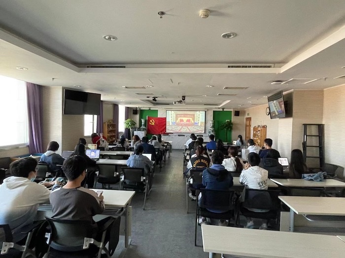 2022年10月16日上午10点,金牌影院 本科生第二党支部组织支部成员开展线下集中观看党的二十大开幕会活动。本次活动在金牌影院 后主楼1318举行,由支部书记谭静文同志组织统筹。支部各同学纷纷踊跃报名,认真学习党的二十大相关精神。 活动内容第一项,全体成员起立,奏唱国际歌。 随着最后一个激昂乐符的落下,活动进入第二项,支部成员共同观看党的二十大开幕会。