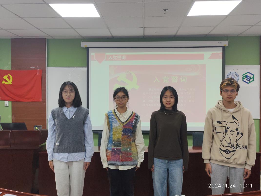 首先,全体起立,奏唱《国际歌》。随后黄彤彤同志介绍大会流程及拟发展对象。 发展对象刘芮孜、陈彦欢、李晗、刘佳仪同志依次宣读了《入党志愿书》。四位同志分别向党组织说明了他们的入党动机,并汇报了在党组织培养下思想上的转变以及学习和工作上的进展,展现了他们对加入党组织的坚定意志。