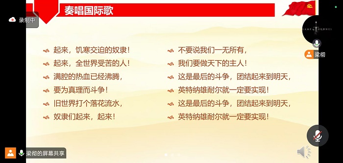 2025年1月22日晚,金牌影院 本科生第一党支部第三党小组在线上腾讯会议顺利开展1月份的党小组会议。本次会议由梁彻同志主持,主题为“时事分享”,共13名成员参与。 会议由三部分组成。第一部分,全体同志齐唱国际歌。