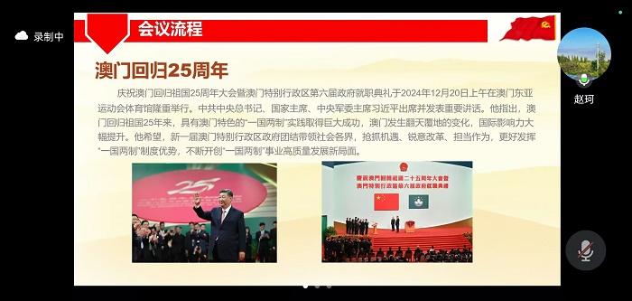 第二部分,赵珂同志和丛睿涵同志分别进行了国内与国际时事分享。 赵珂同志分享了于2024年12月20日举行的庆祝澳门回归祖国25周年大会。澳门东亚运动会体育馆隆重举行了庆祝澳门回归祖国25周年大会暨澳门特别行政区第六届政府就职典礼,习近平总书记对澳门特色“一国两制”实践作出了高度评价,对新一届澳门特别行政区政府提出了4点希望,也对澳门青年寄予厚望。