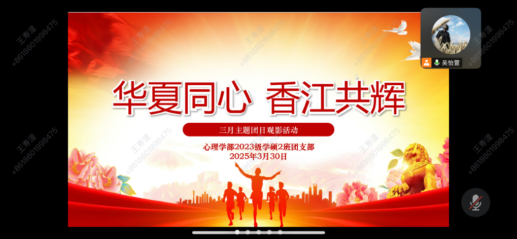 2025年3月30日晚19点,2023级学硕二班团支部“华夏同心,香江共辉”主题团日活动通过线上腾讯会议顺利开展。本次活动由团支书吴怡萱同志主持,共12名党员、共青团员参与。活动通过集体观看电影《我和我的祖国》回归篇,以香港回归历史为背景,沉浸式体验角色并进行小组研讨,深化了团员对国家统一与民族精神的理解,激发爱国情怀与使命担当。