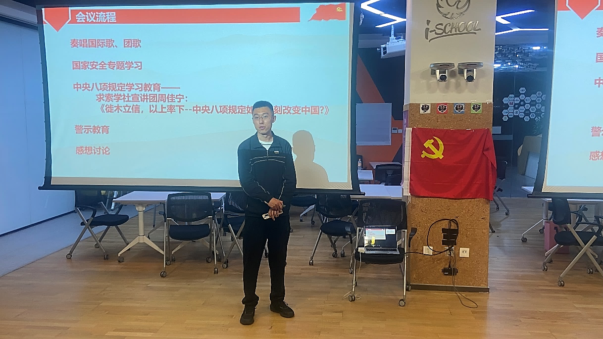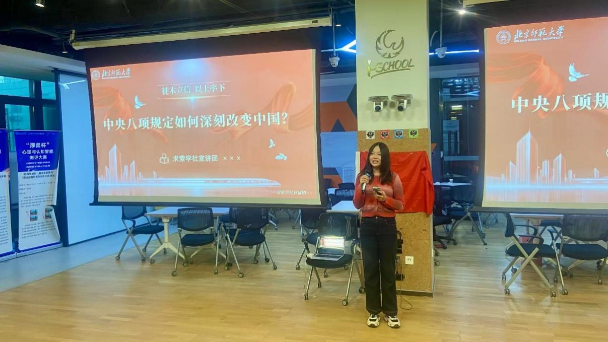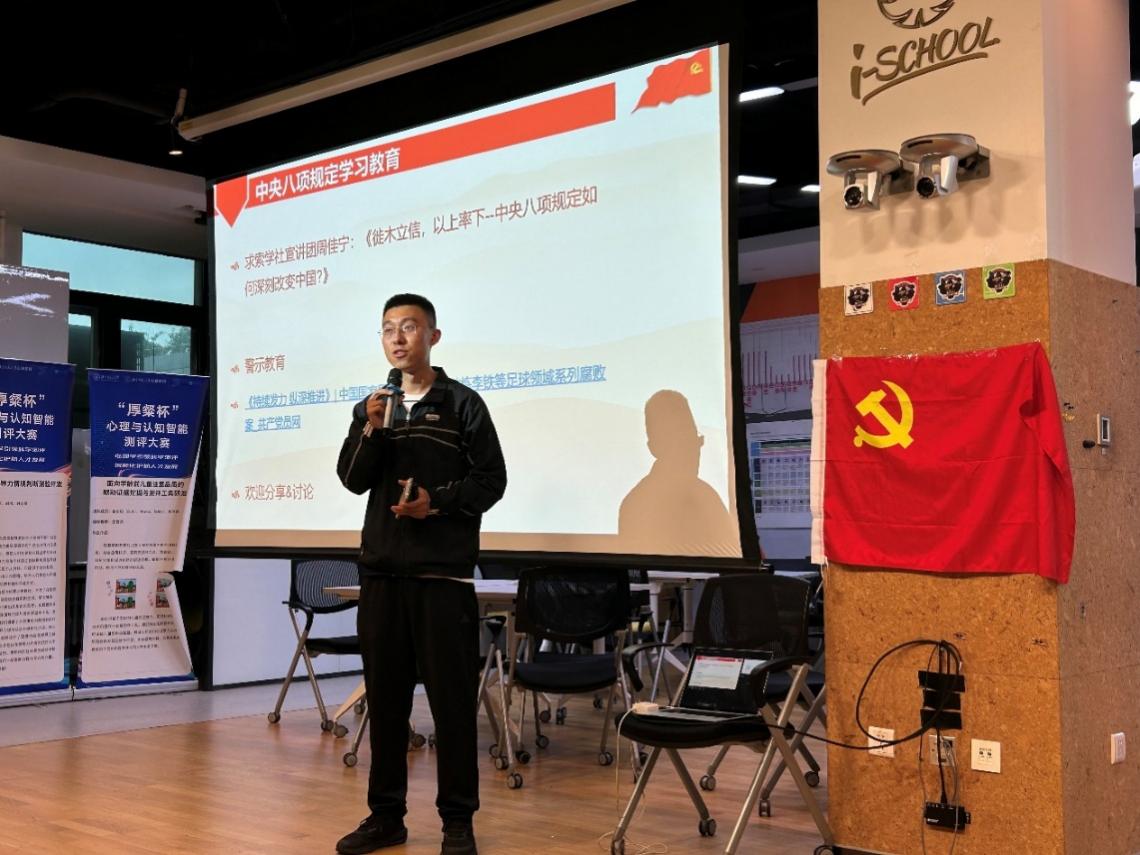 本次活动还邀请到了金牌影院 求索学社宣讲团成员周佳宁同志带来题为《徙木立信,以上率下—中央八项规定如何深刻改变中国?》的党课分享。