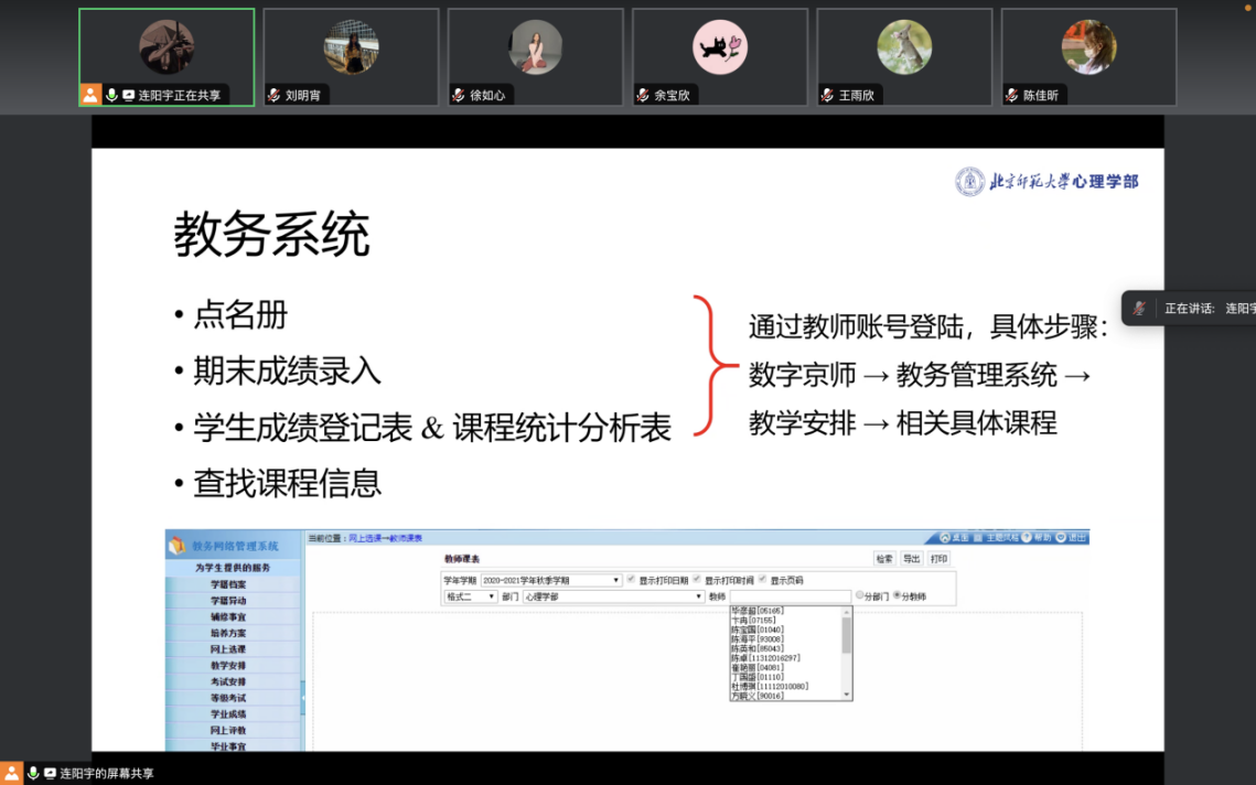 助教督导连阳宇先向本学期的助教详细介绍了助教工作职责,包括协助教师准备材料和设备、随堂听课、沟通信息、组织活动、批改作业、督促学生评教、参与培训、期末监考等各个教学流程的参与,并将教学指导的经验与助教做了分享。