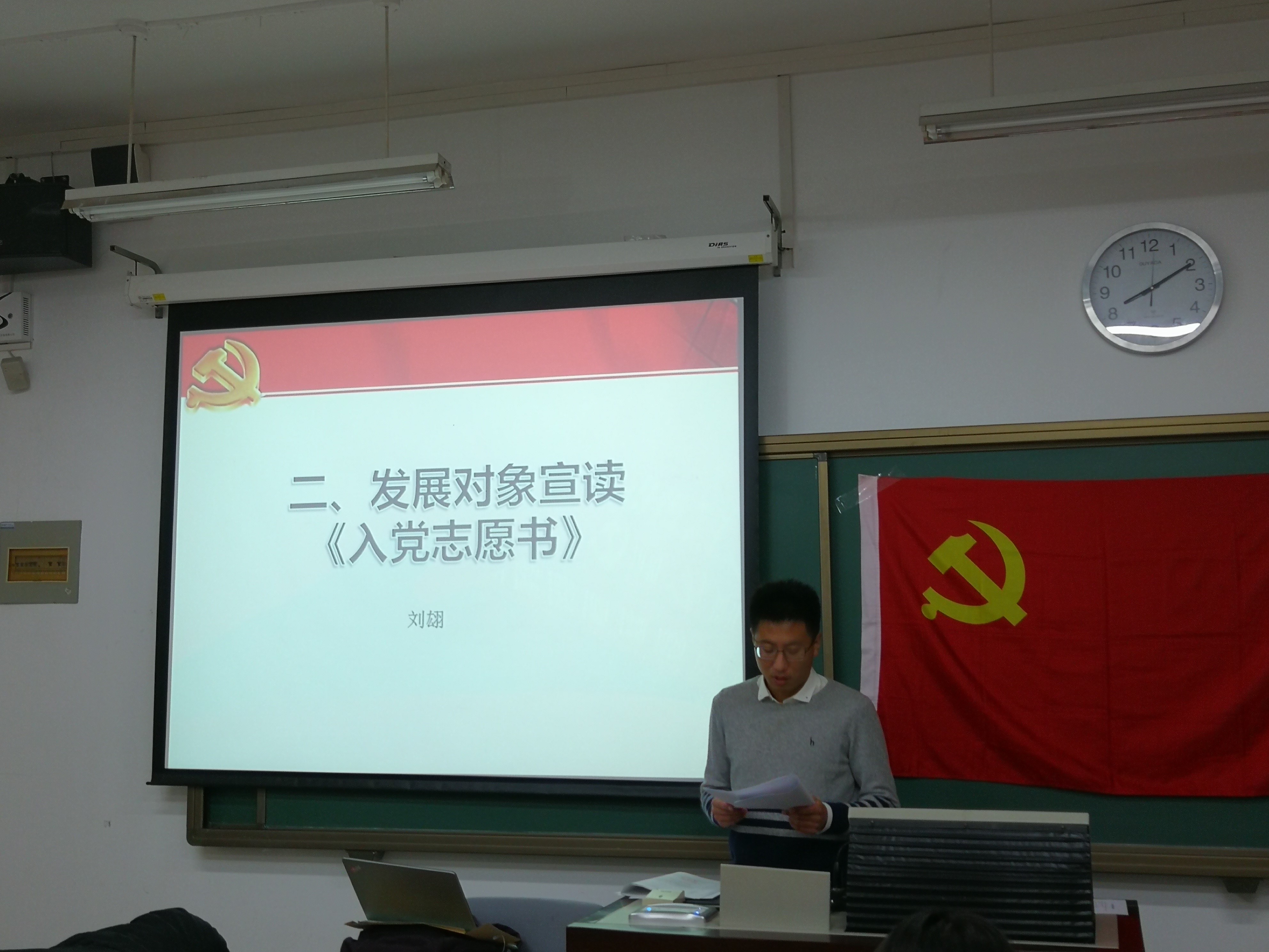 2018年11月29日晚8点,金牌影院 研究生第九党支部在教四楼111教室召开了刘翃同志的发展大会,支部共18名正式党员,实际出席16名,超过正式党员人数的一半,符合召开发展大会的条件。大会由党支部书记笪姝主持。