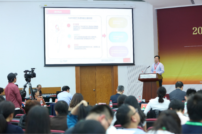 图8:著名文化学者,金牌影院 教授、博士生导师于丹教授发表演讲 著名文化学者、金牌影院 教授于丹教授认为,在经济全球化高速发展的今天,各类组织都在积极实践现代组织管理方法。随着EAP依托心理学及人文社会科学进行组织管理发展的探索,人文管理模式已成为现代组织管理方法的重要成果,它以促进人的全面发展来促进组织的发展。 图9:北京易普斯咨询有限责任公司总经理马凯华发表演讲 作为活动的承办方,中国EAP行业的重要组成部分,北京易普斯咨询有限责任公司总经理马凯华先生结合公司多年来的企业EAP实战经验,介绍了如何利用EAP助力积极组织氛围建设和管理效能提升。并详细地展示了在组织发展的不同阶段与不同关键期,通过EAP的关键技术和方法为企业提供相关的辅助与支持,在防控员工心理风险、提升和改善员工幸福感的基础上,帮助企业进行整体氛围建设和促进管理效能提升。 图10:北京易普斯咨询有限责任公司执行董事、联合创始人郑华辉先生发表演讲 北京易普斯咨询有限责任公司联合创始人郑华辉先生从多年的EAP实践经验出发,提炼精华,为大家生动讲述了变革期员工心理资本复原与安全生产。社会环境的变化、行业的竞争,无论是国家单位还是企业都面临着调整和变动,随之而来的是员工的压力增大、情绪不稳定。而当这种变化成为常态时,企业想要做好员工的心理资本复原就需要了解在变革期的不同阶段员工有什么对应的心理变化,并提供给员工个人心理层面的支持和不同倾向的策略决策。 EAP在企业中的应用 除了以上的各位EAP行业内的专家介绍了EAP的新发展,很多国内知名企业的EAP负责人也在论坛上分享了EAP在自身企业中实际运用和摸索。