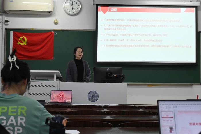 会议内容第二项,黄彤彤同志介绍本次发展对象支部评审会的具体流程。党支部的基本任务之一是“对要求入党的积极分子进行教育和培养,做好经常性的发展党员工作,把政治标准放在首位,严格程序、严肃纪律,发展政治品质纯洁的党员。发现、培养和推荐党员、群众中间的优秀人才。”本次发展对象支部评审会旨在严把党员准入关,发现支部内的优秀人才,实现支部内的充分讨论和广泛征求意见。综合考虑各方面表现后,支部将推荐部分优秀的发展对象参加学部的进一步考核。