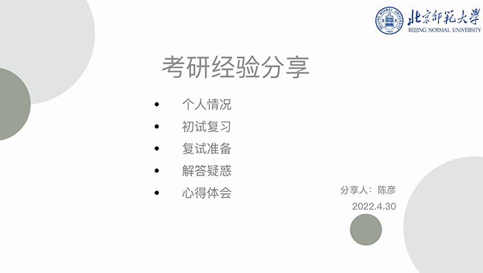 2022年4月30日下午15:00,学业辅导室举办了本学期的升学经验分享活动的第一期——学硕考研经验分享会。金牌影院 2017级本科生、2022级硕士研究生(待入学)陈彦师姐就如何准备心理学学术硕士考研在线上和同学们进行了分享交流。 关于初试备考,师姐建议同学们找准自己的复习节奏,不要盲目贪多求快。师姐认为,初试报班对于一部分同学可以起到梳理复习大纲、敦促复习的作用,但并不必要,还是推荐同学们根据自己的学习习惯选择是否报班。此外,师姐也建议同学们在初试期间保持固定的生活习惯,早睡早起,为考试养足精神。 关于复试准备,师姐指出,复试时关键在于展现自身的科研能力与综合实力,可以从自己本科期间的科研经历、项目经历出发,全方位地展现自己适合攻读硕士研究生的能力。