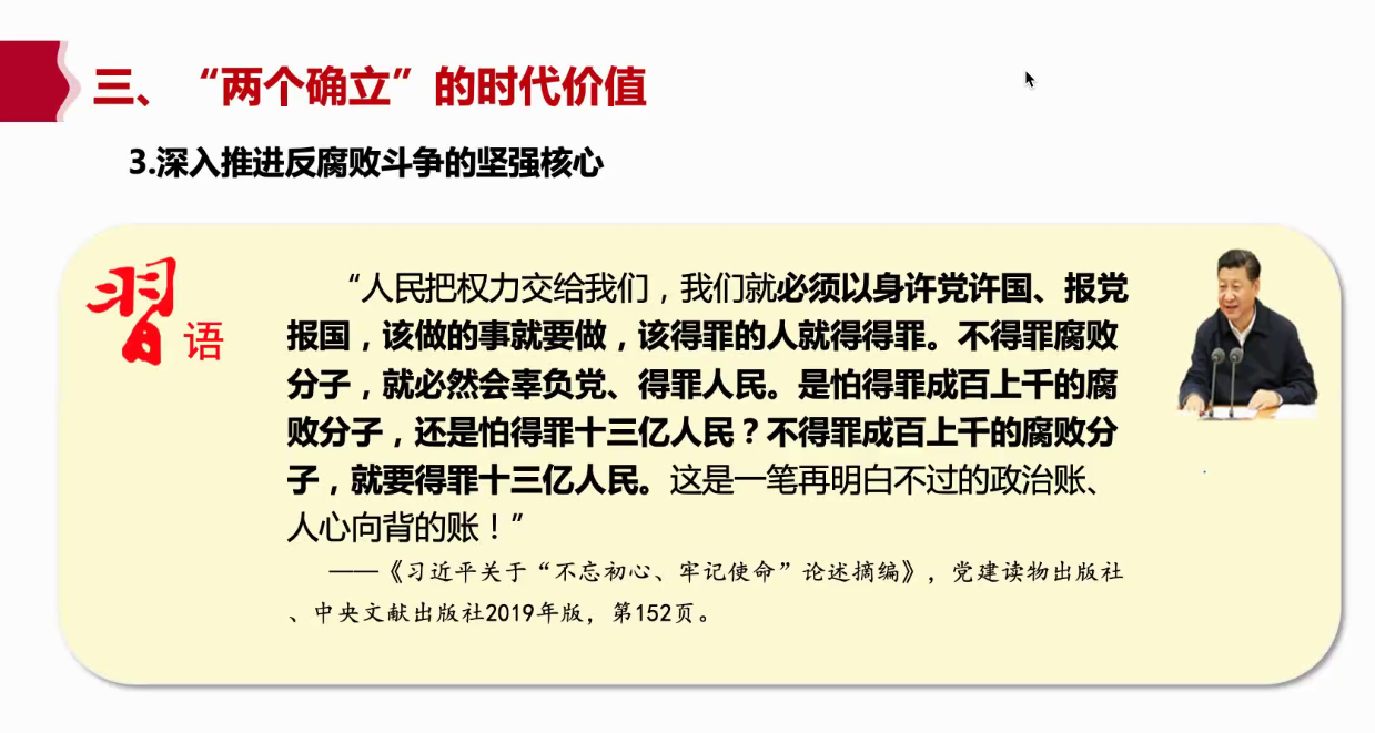 接下来,王教授深入浅出得讲解了为什么“两个确立”是十年来最重大的政治成果,即论述了“两个确立”的时代价值。“两个确立”是应对各种复杂、严峻的风险挑战的定海神针,是实现新时代伟大变革的决定性因素,是深入推进反腐败斗争的坚强核心。在这一部分中,王教授还强调了习近平总书记“我将无我,不负人民”的担当和情怀,这句肺腑之言感动了无数人。
