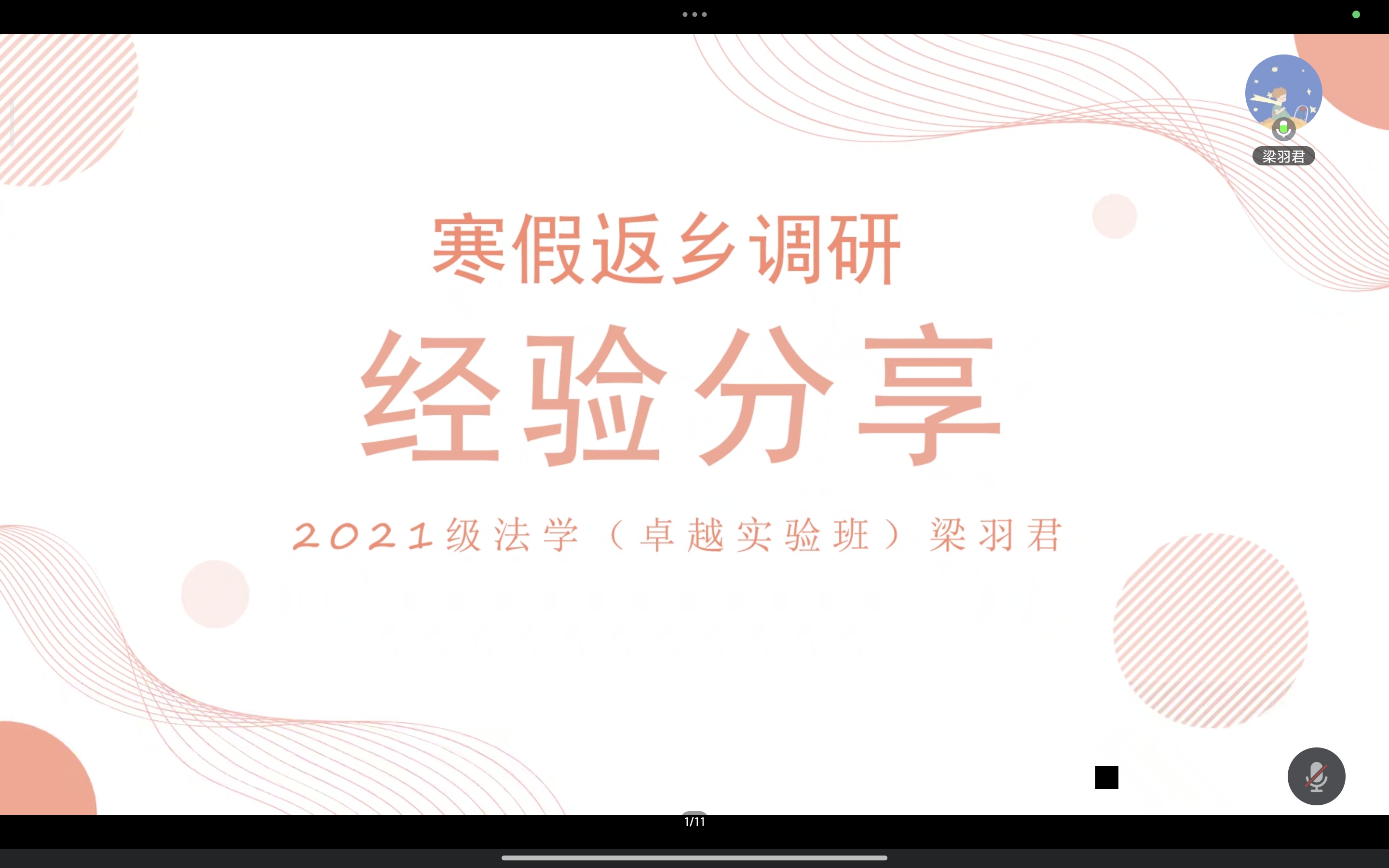 梁羽君师姐介绍了她历次参与寒假返乡调研立项审查工作的情况,并结合自身参与寒假返乡调研的经历,为同学们分享了寒假返乡调研项目申报书的填写经验,并就项目结项需要的相关材料、调研宣传工作等要求进行了讲述。分享内容贯穿了从立项准备到结项评优的全过程,内容详实有趣,为同志们提供了宝贵的参考经验。