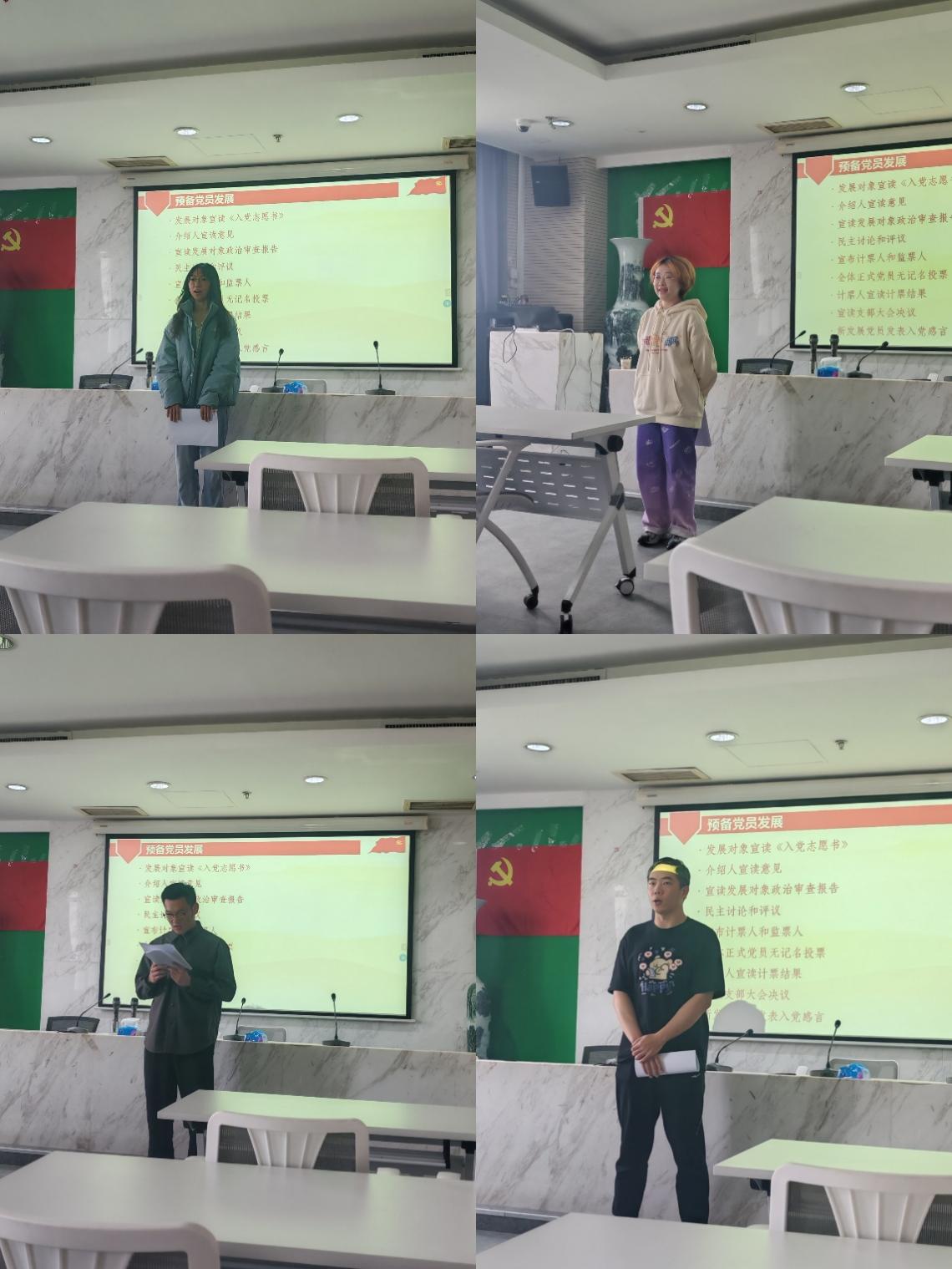 第二次发展大会于13时召开,主要讨论陈慧敏同志的发展事宜。 陈慧敏同志宣读了入党志愿书,向党组织说明了入党动机,并汇报了自己在向党组织靠拢的过程中,思想上的提升以及学习和工作等方面的进展。同上午开展的第一次发展大会流程一致,在发展对象宣读入党志愿书后,均完成了介绍人意见和政审报告宣读、大会民主讨论、正式党员表决,以及大会决议宣读等严谨的系列步骤。拟发展同志在思想理论、学习工作和生活作风等方面均获认可。在民主讨论环节,与会党员们也分别作了点评。经过支部全体正式党员的无记名投票表决,一致同意陈慧敏同志为中共预备党员。