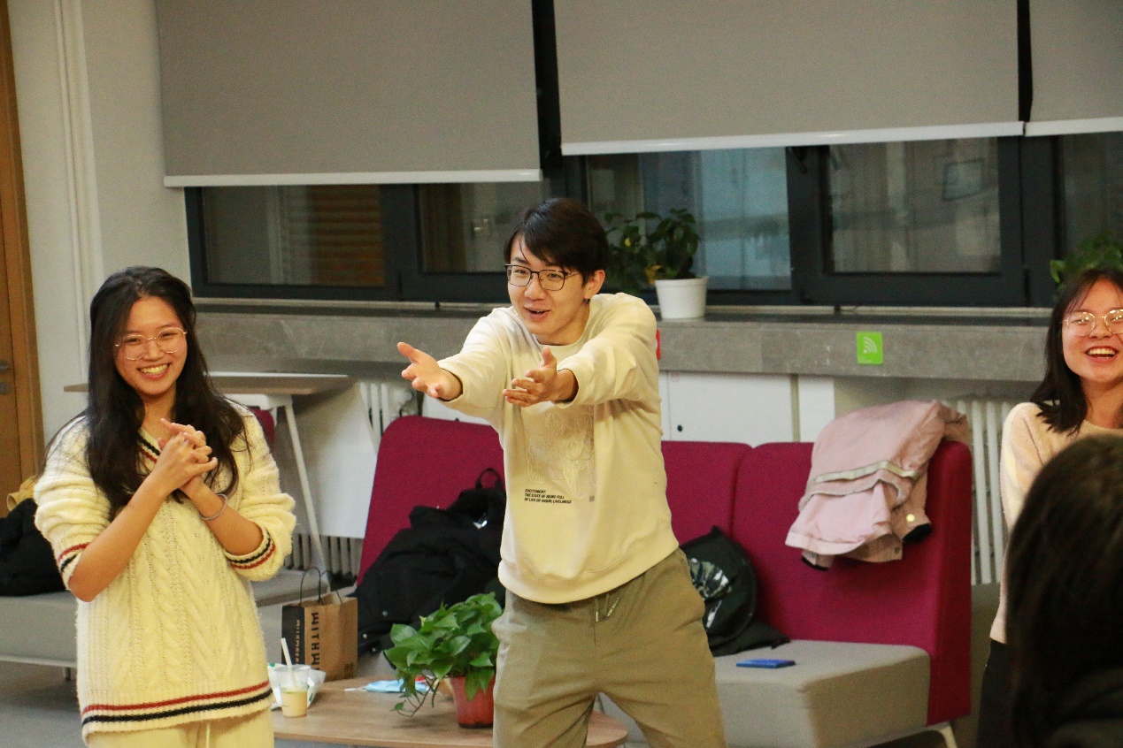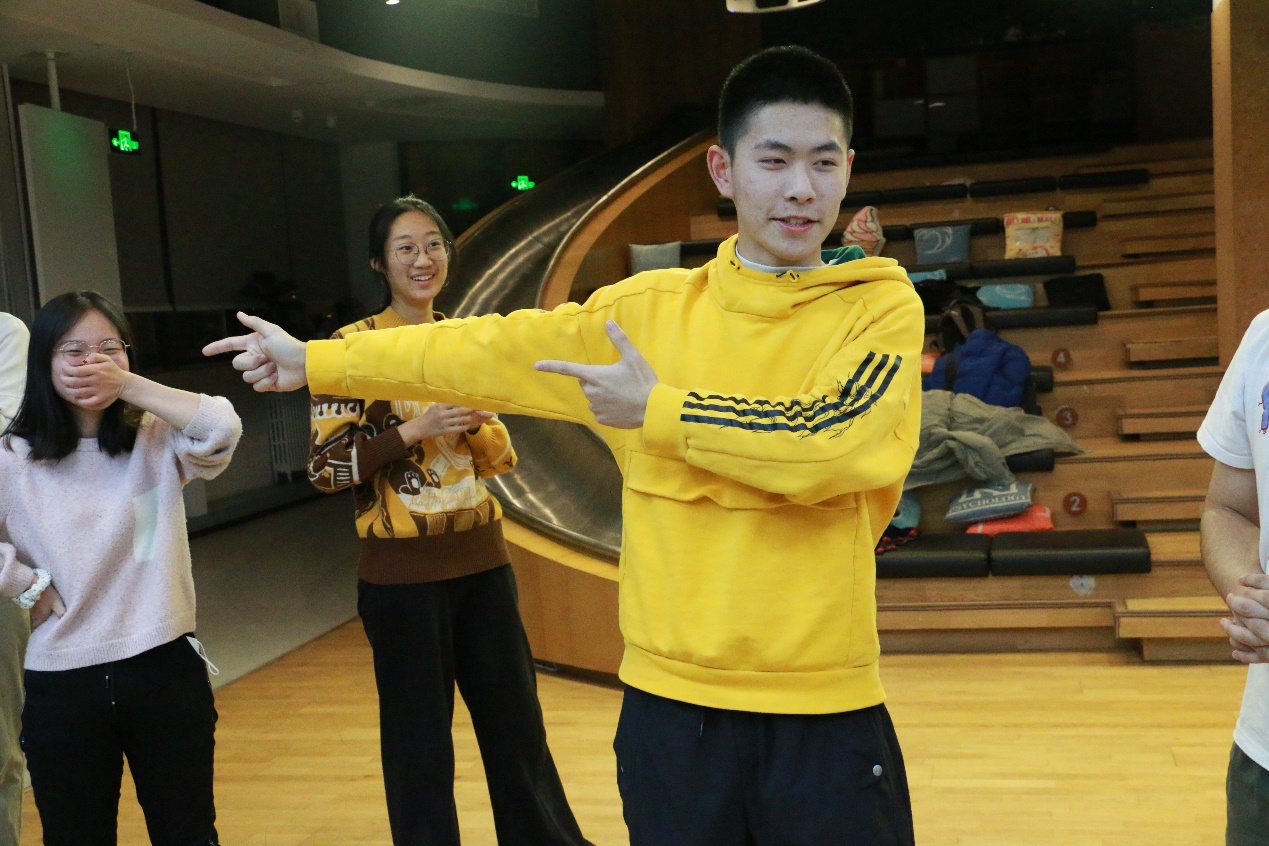 为加强心理建设在班级精神文明建设中的作用,通过集体活动的形式提升学生的心理素质水平,突出班级活动的“心理”特色,金牌影院 2020级本科2班于2021年12月18日晚19:00于金丰和路演厅与金牌影院 即兴戏剧椰丝团举行了“2020级本科2班×椰丝团工作坊”共建活动。 班委在10月份便与椰丝团提前沟通准备,活动恰逢六级英语考试结束和期末压力较大的阶段,椰丝团成员们为2班同学精心设计、准备了适合当前阶段缓解压力的游戏活动。 活动由椰丝团团长瞿弋丁同学主持,首先由热身游戏“疯狂八”让同学们放松身体,进入活动的状态。接着,下一个活动“yip yap yup”进行能量传递,由一个家族逐渐增加难度,没有做出相应动作的“大明星”和同学们击掌,当难度增加到大家有些手忙脚乱时,主持人宣布接下来的环节中不中断游戏,无论ta有没有做出正确的动作,都会被say yes,并由接收能量的同学顺着正确的轨道进行下去。