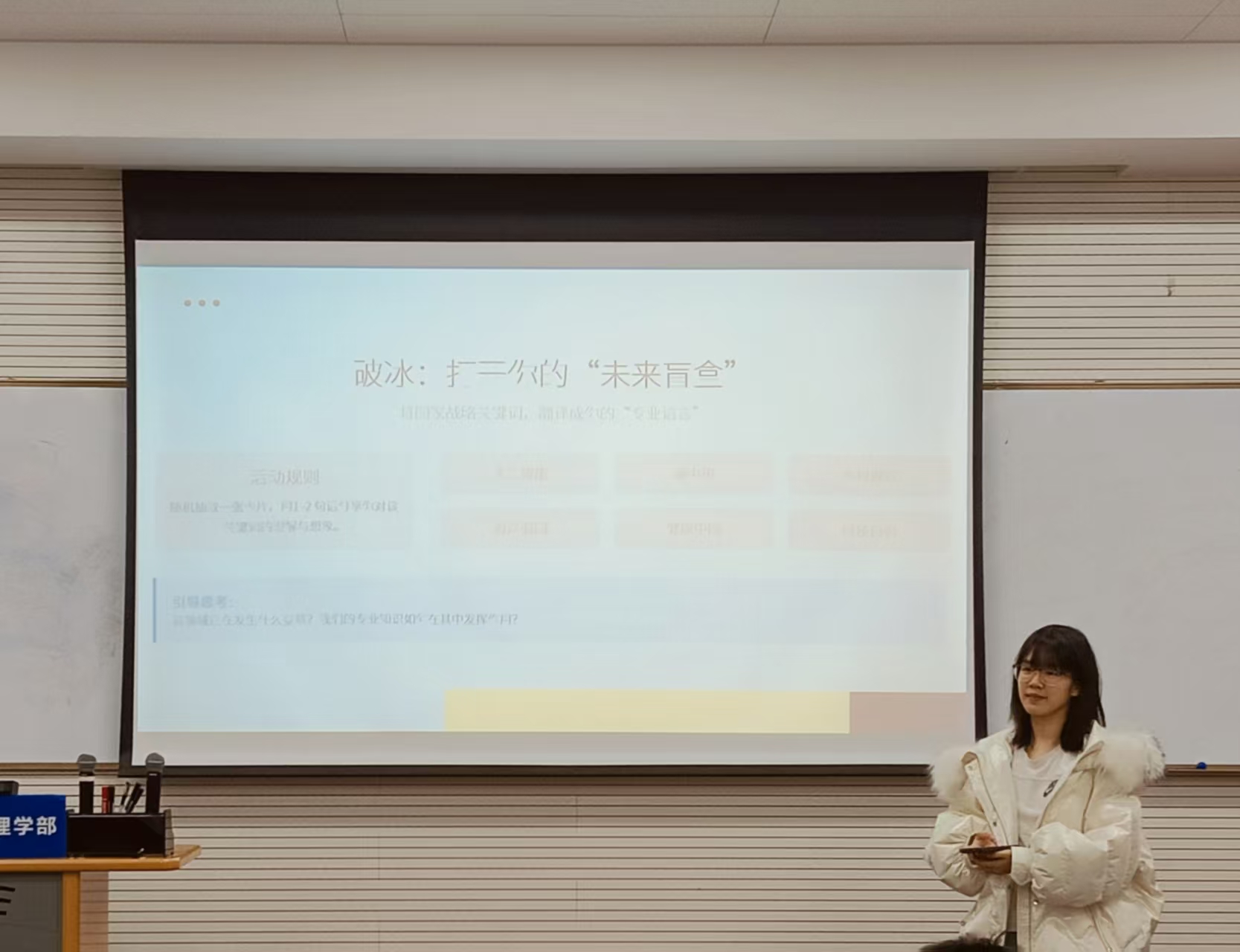 紧扣国家战略,激发青年思考。团支书邵小雅首先介绍了“十五五”时期国家发展的重点方向,包括科技自强、乡村振兴、碳中和、人工智能、健康中国、海洋强国等关键领域。她强调,作为心理学专业的学生,不仅要掌握专业知识,更要思考如何将心理学服务于社会心态建设、心理健康促进、组织行为优化等领域,在国家战略中找准自己的位置。 在互动环节“共话专业与国家的连接”中,同学们随机抽取写有国家战略关键词的卡片,结合心理学专业背景,用1-2句话分享自己的理解与想象。 有同学抽到“海洋强国”,提出:“心理学能够帮助深海作业者克服恐惧,保证深海工作的正常开展。”