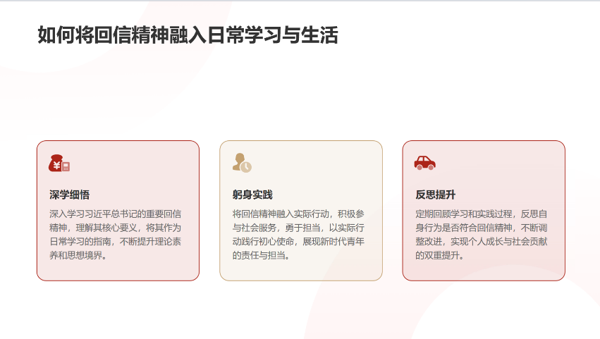 在交流讨论环节,同学们积极发言,结合自身实际谈感悟、话心得。大家分享了对回信精神的理解,以及如何在日常学习和生活中践行回信精神。有的同学表示要以支教志愿者为榜样,把个人理想融入国家发展大局;有的同学表达了要努力学习专业知识,练就过硬本领,为社会贡献自己力量的决心。