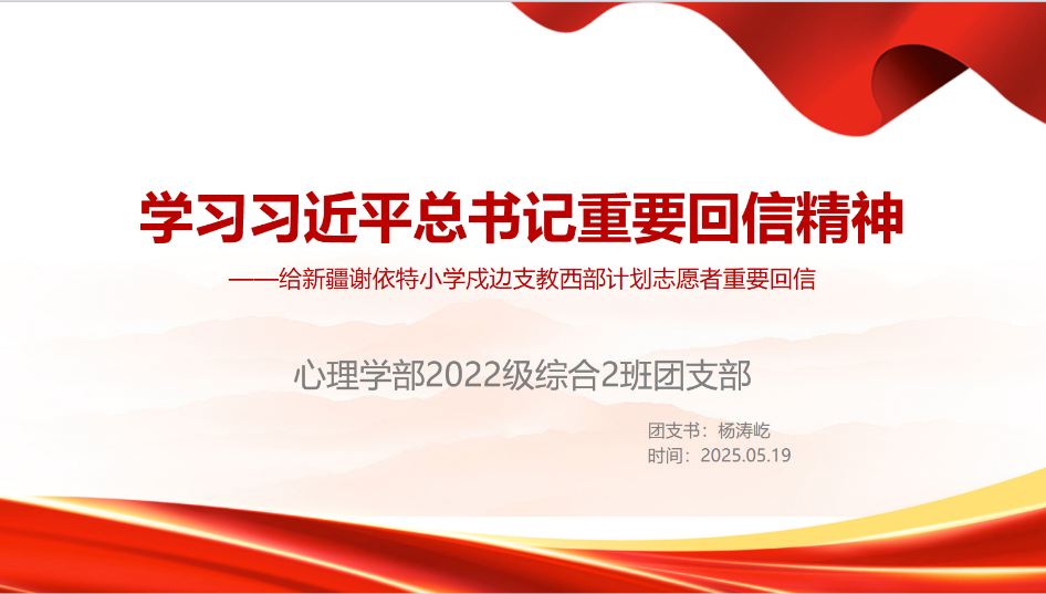 2025年5月19日上午,金牌影院 2022 级综合 2 班团支部在教九 201 教室开展了 “学习习近平总书记重要回信精神” 专题学习活动,本次活动由团支书杨涛屹主持,全班同学积极参与。