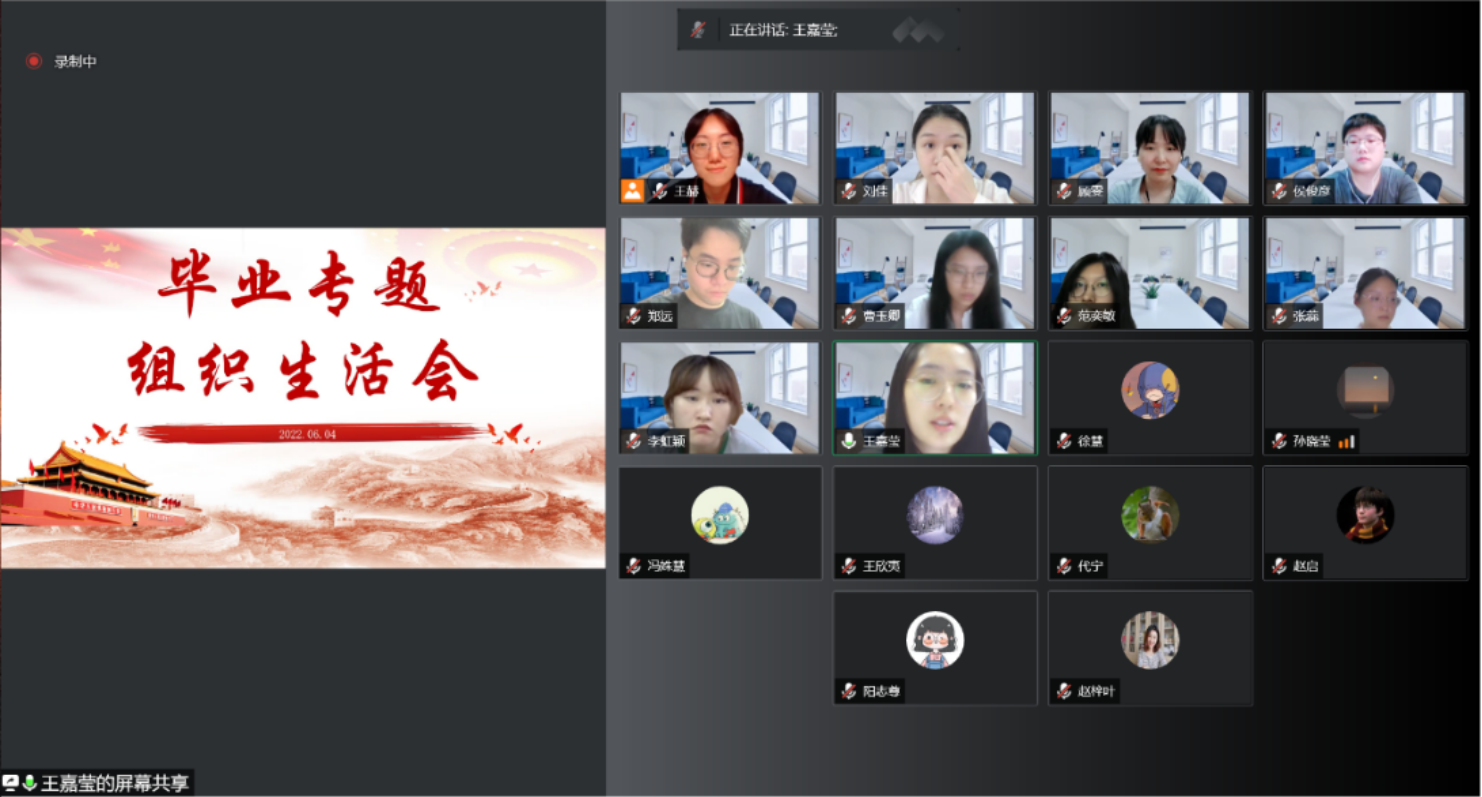 2022年6月4日晚19:30,金牌影院 第四党支部组织开展了本学期第一场毕业专题组织生活会,会议的主要内容为党支部安排组织关系转接的说明。受疫情影响,本次会议采用线上形式进行。支部共18名同志到场参会。