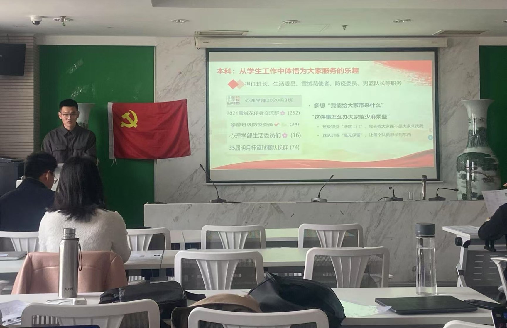 程先楷同志首先介绍了发展对象的总体情况,并阐述评选规则和评选流程,要求与会党员站在党的事业后继有人的高度审慎做出评分。随后,王陈龙、张立颖等8位同志逐一上台进行各自的答辩,分别介绍自己在思想政治、学习生活和入党动机深化等方面的情况,并针对支部党员们提出的问题做了回答。台下的党员同志们积极地对评审材料和答辩PPT制作等提出了宝贵建议,以期各位积极分子能在学部评审会上更好发挥。