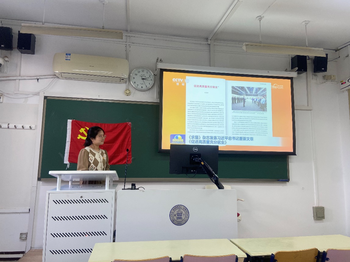 唱毕团歌后,进入本次团日活动的理论学习部分。付晨露同志带大家观看了《新闻联播》有关报道,主要关注高质量充分就业和二十届三中全会精神。与会团员一同学习了习近平总书记在《求是》杂志上发表的重要文章和在省部级主要领导干部学习贯彻党的二十届三中全会精神研讨班开班式上的重要讲话。