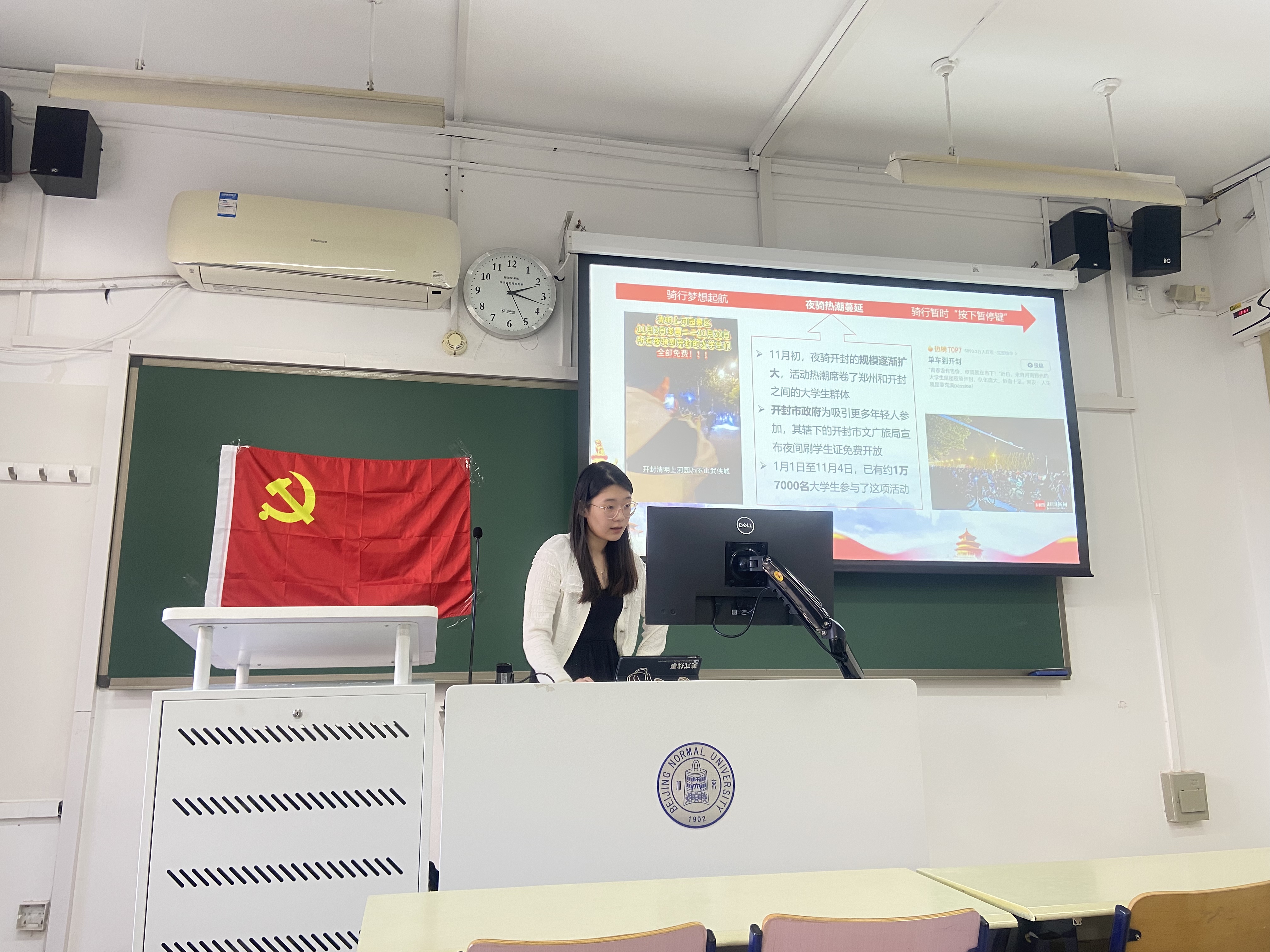 窦佳宁同志则为大家详细梳理了郑州大学生夜骑开封的事件始末,引导我们以全面而辩证的视角分析社交媒体上的热议话题与社会实际的交互,鼓励大学生应该既要“passion(热情)”,也要“安全”。