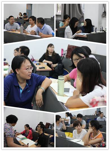 张景芳老师,北京教育学院石景山分院德育心理研究中心主任,国家二级心理咨询师,注册心理咨询师,中学高级,北京市心理学骨干教师。主持承担过区级、市级重点课题多项,主要研究方向是中小学生团体心理咨询、中小学教师团体辅导能力及主观幸福感的提升。现任北京教育学会教育心理学研究会副理事长,北京心理卫生协会学校心理卫生委员会常委委员,首届北京市中小学生学习困难研究会石景山分会常务理事。 讲座伊始,张景芳老师对同学们提出了十二个字的学习期望——“我参与,我奉献,我收获,我快乐”,鼓励同学们积极参与讨论、主动分享,因为分享才会更有收获,有了收获才会更快乐。 接着,张老师抛出了两个问题供大家讨论交流。“学校心理健康教育谁负责?负什么责?”“学校心理健康教育的组织是怎样的?人员是哪些?任务如何?” 同学们积极讨论,主动分享,会场气氛十分热烈。 图三:北师大心理学院2015级暑期应用心理专业硕士专题讲座第六讲现场——同学们就张老师提出的问题积极讨论并主动分享