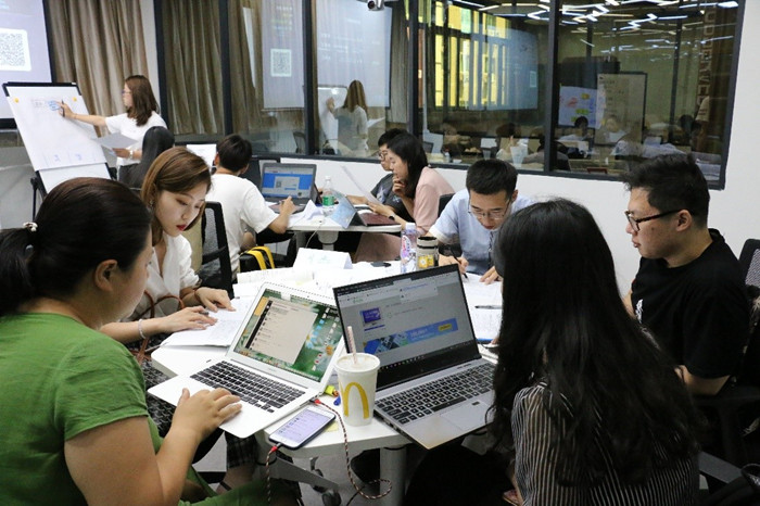 上午的授课结束后,进入到课程的第二部份:模拟实战练习。学员们被分成三组,模拟不同的商业咨询公司,对客户公司的商业模式进行分析并给出建议。每个小组需要制作PPT上台展示,由三位评委老师进行综合评分,最后评选出一个最佳团队。学员们共有三个小时的准备时间。