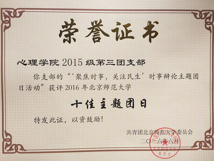2016年6月17日,校团委公布了“青年责任+”优秀主题团日的评选结果。我院15级第三团支部“‘聚焦时事,关注民生’——时事辩论主题团日活动”以创新的活动形式、深刻的活动内涵、团员积极的参与意识、基层团支部“家”文化的充分体现获评“2016年金牌影院 十佳主题团日”。