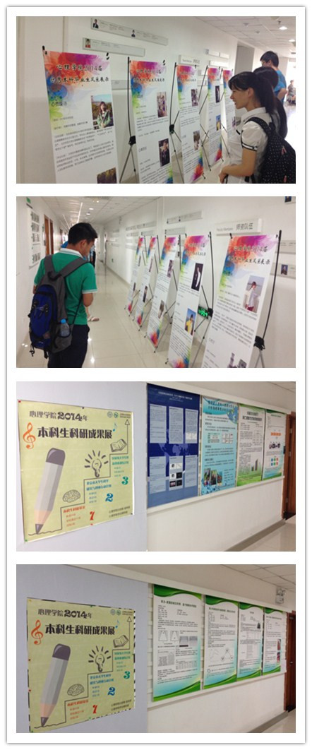 2014年5月28日,心理学院分团委、学业辅导室联合举办“树榜样,促学风”本科生系列展览。本次系列展览包括在后主楼14层举办2014届优秀本科毕业生风采展;在后主楼15层举办2013—2014学年优秀本科生科研成果展。 2014届优秀本科毕业生风采展向院内师生展示了来自2010级非师范班的黄思佳、李辉、张萌、费蕾诗、张晗、诸海婷,来自2010级师范班的蒋雷、王英璐、杭宁、熊雪琳等心理学院2014届优秀本科毕业生风采。呈现在展板上的,无论是这些优秀毕业生的出众成绩、还是他们的毕业感悟,亦或是对于师弟师妹语重心长的指导,都让老师同学们深有体会。 2013—2014学年优秀本科生科研成果展展出了2013—2014学年心理学院结项的国家级大学生创新创业训练计划、北京市大学生科学研究与创业行动计划和校级本科生科研基金的研究成果。其展出内容几乎涵盖了心理学的各个主要领域。在展板中,不仅包括了项目组成员信息和项目内容,也包括了项目的创新亮点,并附图表进行说明,使得老师和同学们能更好的理解。 本次系列展览以“树榜样,促学风”为主题,在向同学们宣传先进典型、树立优秀榜样的同时,也促进了我院学风建设,展览受到我院师生的一致好评。 (心理学院分团委、学业辅导室)
