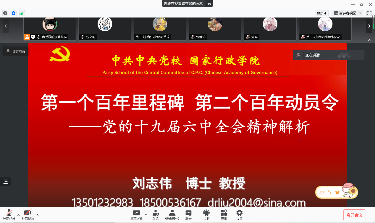 2021年11月18日下午3点,研究生第六党支部组织同志们参加中央党校刘志伟教授主讲的十九届六中全会精神解读专题讲座,此次活动共21名党员和入党积极分子参加。本次讲座的主题是“第一个百年里程碑 第二个百年动员令——党的十九届六中全会精神解析”。
