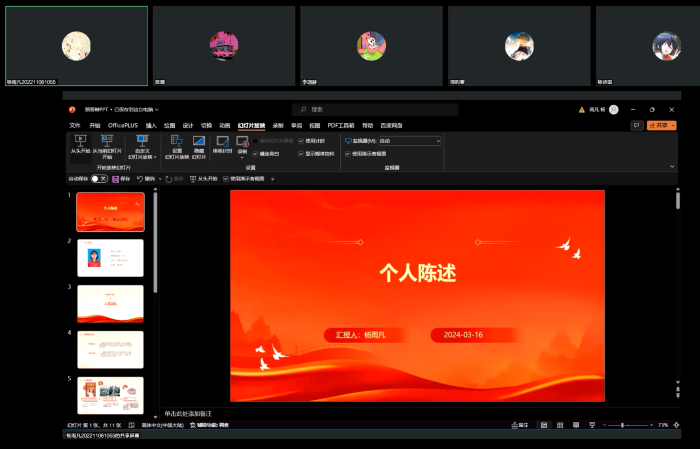 2024年3月16日晚8点,金牌影院 本科生第一党支部顺利开展2023-2024学年春季学期发展对象支部评议会。会议通过“腾讯会议”平台以线上会议的形式进行,由陈璐同志主持,共30名成员参与。本次会议主要为党支部对12名发展对象的内部评议,环节分为发展对象答辩、党员评议和党员打分三部分。 会议开始,陈璐同志带领全体同志奏唱了国际歌。