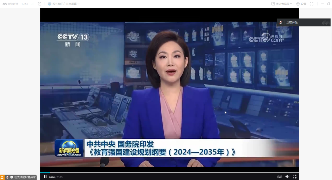 近日,中共中央、国务院印发了《教育强国建设规划纲要(2024-2035年)》,对加快建设教育强国作出了全面系统部署。会议开始,支部书记首先领学了这一重要文件。程先楷同志简要阐述了教育强国的重要性,并播放《新闻联播》的相关报道及相关专家解读。同志们对思政课教育、德智体美劳全面发展、高质量教材等几个方面进行了学习。领学后,程先楷同志号召大家会后详细学习文件原文,并在学习生活中落到实处。