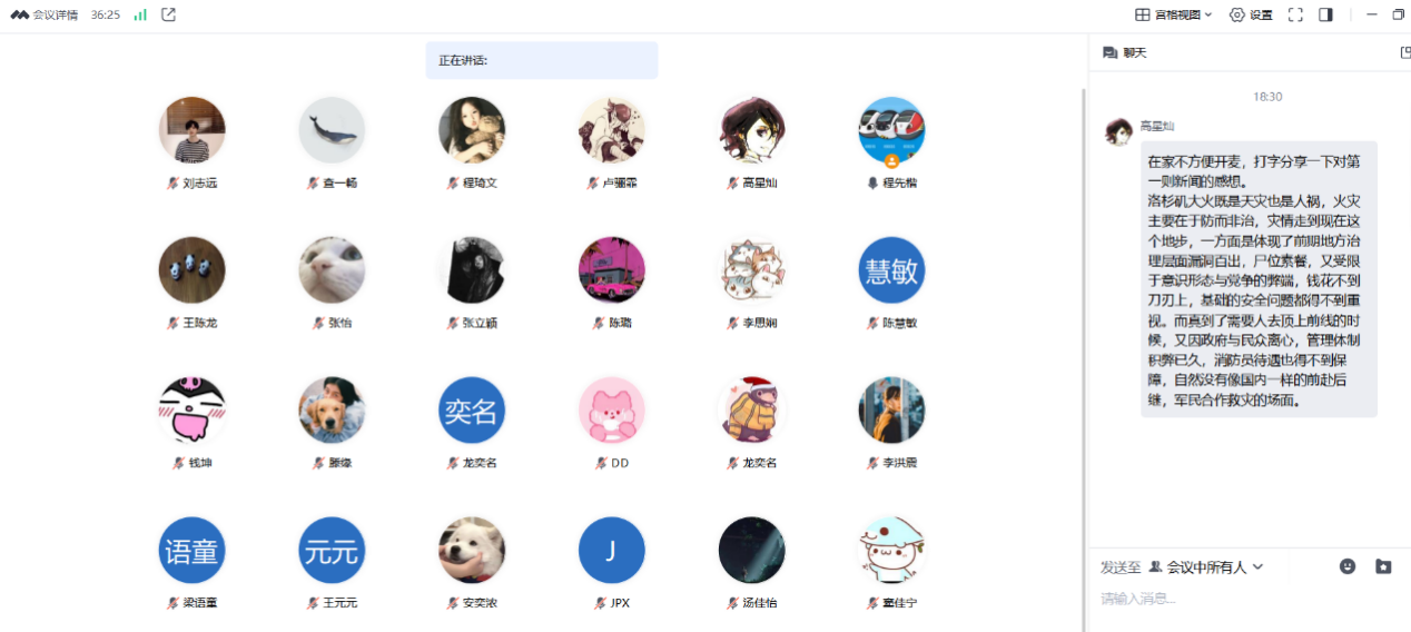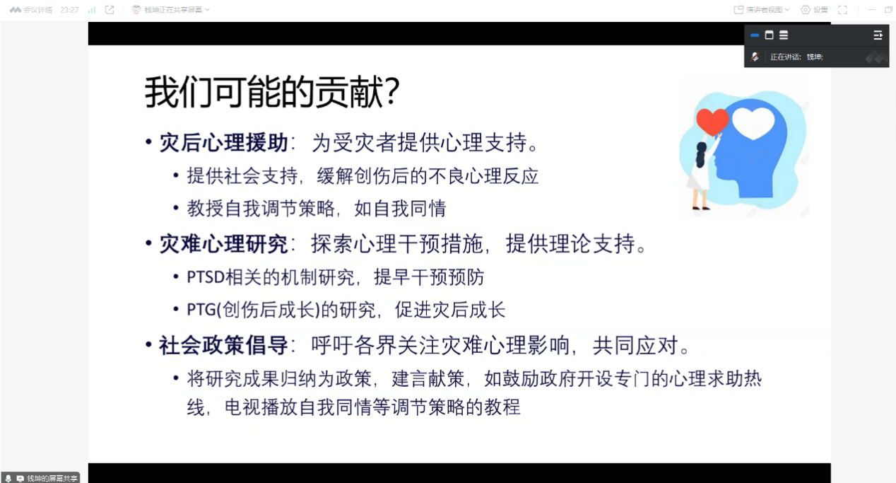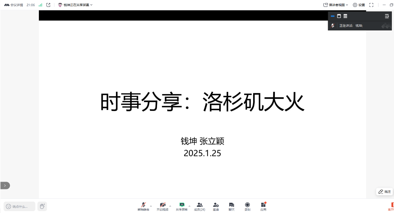 接下来是支部的“讲党课、观时事、宣科普、促科研”分享活动。程先楷同志介绍了本次做时事分享的两组积极分子。 第一部分是由钱坤和张立颖两位同志带来主题为《洛杉矶大火》的国际新闻分享。钱坤同志按事件发生发展的时间线梳理了本次山火的蔓延情况,并介绍了美国当局对此施行的相应举措。我国素来重视气候问题,将生态建设与环境保护摆在发展的重要位置。钱坤最后提到,作为心理学生,我们可以在心理援助、社会政策倡导与宣传等工作中贡献力量。