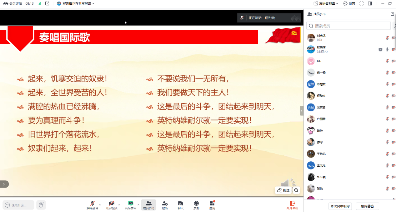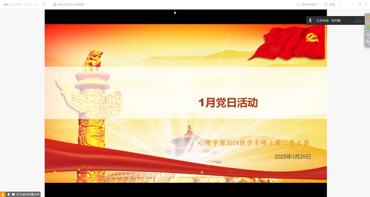 2025年1月25日晚6时,金牌影院 2024级学术硕士第二党支部通过线上平台顺利开展本月主题党日活动。会议由党支部书记程先楷同志主持。支部9位正式党员和14位积极分子到场参会。