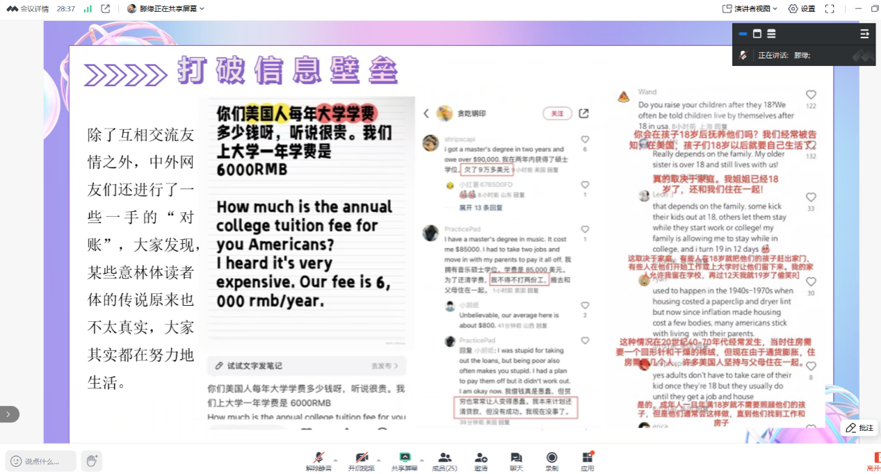 第二组作分享的是滕缘和张怡两位同志,题为《小红书涌入外国网民》。滕缘同志从Tik Tok(抖音国际版)在美国拜登政府的政令中屡屡受挫并面临停服的情况谈起,引出国内新兴社交媒体平台小红书是如何成功地在此次风口中成为弄潮儿。随后,滕缘以东西方文化交流、信息壁垒打破和国产应用软件崛起为角度展开,总结了这一时事。