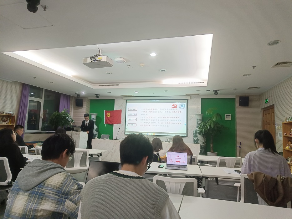 会议内容第一项,全体参会同志起立,奏唱《国际歌》。 会议内容第二项,王珂莼、孙梓耀等20名发展对象进行两分半钟的答辩,介绍了各自的入党动机、学习思想情况及社会实践情况,并深刻地对自己的优缺点进行了反思。在各位发展对象答辩之后,参会党员依据答辩表现和日常培养考察情况进行评分。