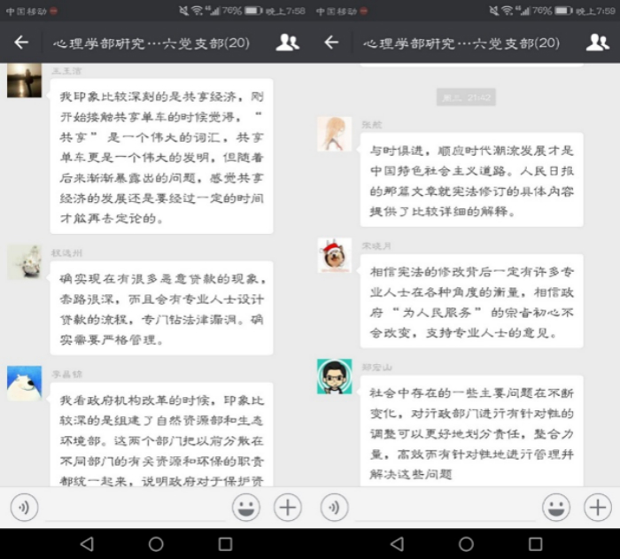 2018年3月16日晚,研究生第六党支部号召全体党员和积极分子进行了“两会”主题线上分享活动,2名党员结合近期两会情况分享了金牌影院相关的文章和心得,其他党员也积极参与,讨论发表了自己的看法。 李昌锦同志分享了几篇关于修宪和国务院机构改革的文章,并谈到今年的两会,适逢中国改革开放40周年。40年来,中国改革开放一路向前,而改革开放只有进行时没有完成时。今年两会对宪法进行了修订,对国务院机构进行了改革,还有监察体制改革、税收体制改革等,这些变化透露出重要改革指向:把发展经济着力点放在实体经济上;标本兼治防控金融风险;推进乡村振兴;“放管服”改革为市场主体添活力,为人民群众添便利;增强激励释放创新活力;多办利民实事、多解民生难事。站在新的历史起点,面对社会主要矛盾的转化,需要改革不停顿、开放不止步,将改革开放进行到底。郑宏山同学就国务院机构改革表示社会中存在的一些主要问题在不断变化,对行政部门进行有针对性的调整可以更好地划分责任,整合力量,高效而有针对性地进行管理并解决这些问题。关于宪法修订同学们也表示,宪法也需要根据时代和社会发展发生变化,没有什么是一直静止保持不变的。并且相信宪法修订背后有很多专业人士在各种角度的衡量,相信政府“为人民服务”的宗旨和初心不会改变。同时同学们纷纷认为给大众普及修改宪法的必要性是十分重要的。 李羽萱同志分享了几篇两会热点的文章,认为今年两会公众最关心的热点主要有:反腐败斗争、社会保障、教育公平、医疗改革、脱贫攻坚、住房制度、改革开放、环境保护、乡村振兴和依法治国。上到国家大事,下至百姓身边,今年的两会也是解决中国人民问题的会议,听到一些代表们的提案,内心都会产生强烈的赞同感。其他同志也由此发散开来,就人工智能、共享经济和环境治理等主题并结合自身实际进行了热烈的讨论。 通过这次分享活动,同志们对最近的一些两会热点有了更深刻全面的认识,并纷纷表示在以后的学习生活中也要从关注时事政治做起,多关心社会、了解社会,从而更好地为社会服务。 供稿:刘苗苗 供图:刘苗苗 |