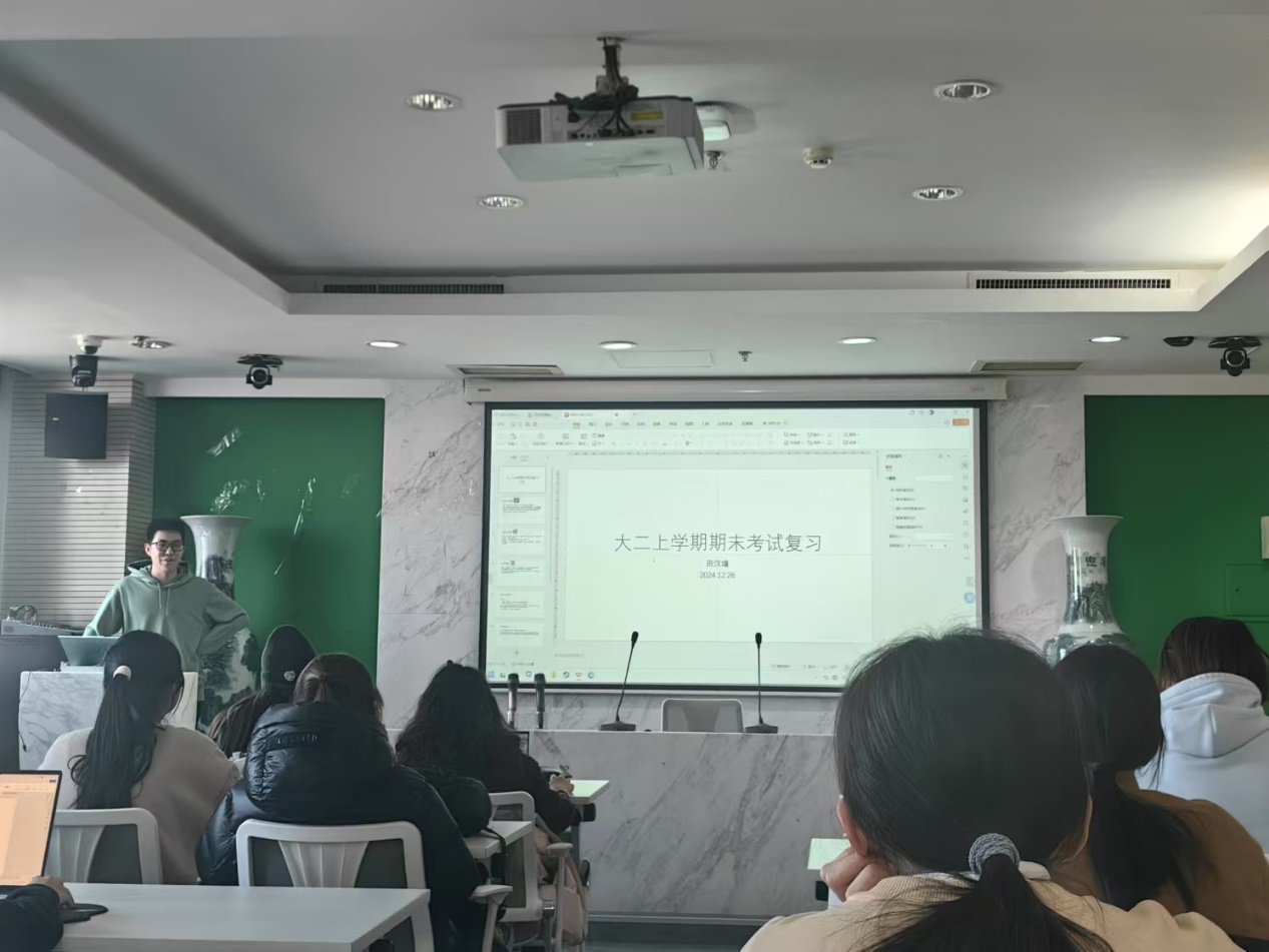 首先,班长就寒假调研实践活动进行了一个简短的介绍,并分发考试诚信承诺书让大家进行填写。接着,由田汉墉师兄给同学们带来考试经验分享,介绍了大二的几门专业课的考试重点和考试技巧,同学们收获颇丰。