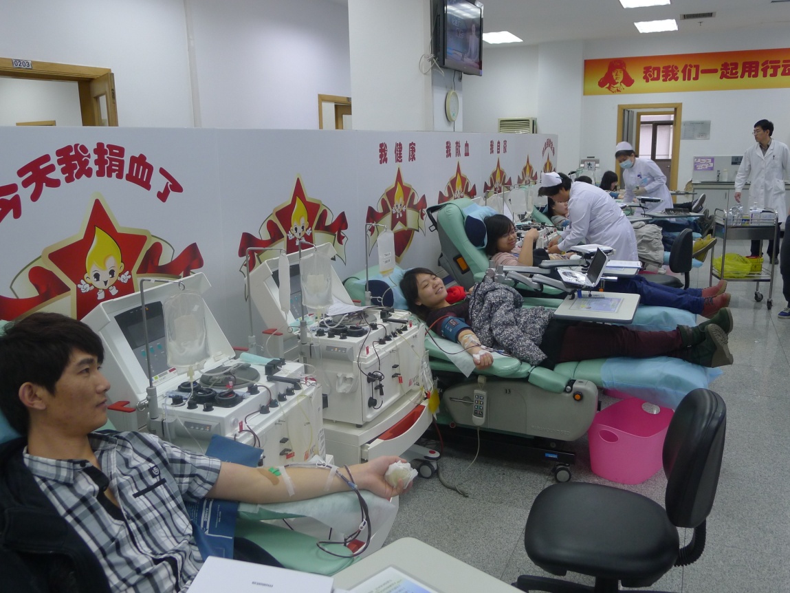 2013年4月19日上午,心理学院四十余位学生在学生工作办公室曹昌健老师和校医院医生的陪伴下,参加了位于北京市红十字血液中心的无偿献成分血活动,为他人献出自己的爱心。 早晨七点半,参加献血的同学早早在科技楼前集合,准备前往位于北太平桥附近的北京红十字血液中心。这次参加无偿献血活动的同学中大多数都是第一次参加无偿献血,心里既兴奋又紧张。 来到北京红十字血液中心,经过验血,此次参加献血活动的四十余名同学中有36名同学适合献血。由于感冒等原因不能参加献血的几名同学,带着遗憾离开了血液中心,他们表示等身体条件合适的时候一定再来献血。适合献血的同学陆续进入献血室进行献血,期间有一些同学产生了头晕等不良反应,经过短暂休息后,仍然继续完成献血。带队的曹昌健老师和血液中心的医生还为同学们用相机和拍立得拍照,帮大家记录下这个难忘的时刻。 此次无偿献成分血活动共成功采集了36个单位的血小板,充分体现了心理学院同学的爱心。