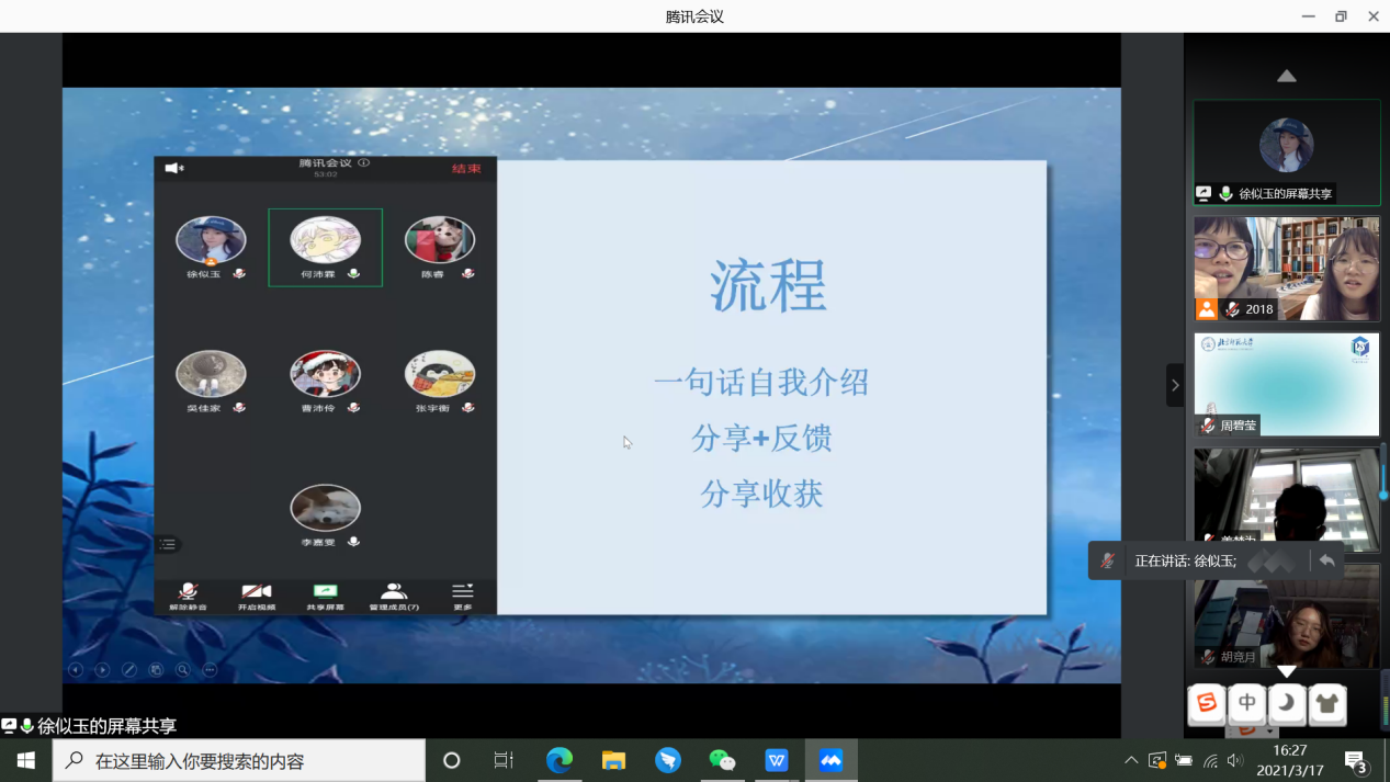 2021年3月17日下午2点半至4点半,金牌影院 2018级本科生成功举办了线上年级大会。本次会议由2018级本科生辅导员黄利老师和周以铭老师主持,共114名学生参会。会议共包含两个议题:一、实习交流与分享;二、“好久不见,认识自己和更多的你”心理健康团辅。 在实习交流与分享环节,首先,由金牌影院 党委副书记王瑞敏老师向大家介绍了金牌影院 2020届本科毕业生未就业的情况和近几年的考研形势,王瑞敏老师告诫大家要主动把握自己的生涯发展,如果决定读研就要背水一战尽早开始准备,如果决定不读研那么这学期就要启动求职准备。 之后,具有丰富实习经验的2017级本科生车梦盈和正在实习的2018级本科生张琬琰向大家分享了自己的求职经验以及工作感悟等。两位同辈的分享详细且实用,令大家收获颇多。 接下来是“好久不见,认识自己和更多的你”心理健康团辅环节,分为前期准备和报告展示两个部分。 在年级大会前一天进行活动准备,金牌影院 本科2018级全体140名同学,被随机分配到14个小组,组内选出一名组长,组织大家以小组的形式开展团辅练习和活动分享。团辅练习的内容主要包括大家对于过去假期的回顾和对于未来生活的展望,每个人认真完成后,由组长组织,在年级大会开始前,围绕团辅练习的内容进行小组内交流分享,并商议决定大会上的3分钟小组展示内容、形式等。 会议上,14个小组按照随机的顺序报告,组长们都用心地总结了大家小组分享的内容,很多组也专门制作了精美的ppt,为我们展现了大家丰富多彩的假期生活和有关新学期的形形色色的期待。从中,我们能看到同学之间很强的共性,但也能感受到强烈的个性,无论是客观生活上的不同,还是在写团辅练习时的唤起和关注点的不同,在听到大家的分享后也会再次引发我们的联想和思考。 小组分享结束后,有同学说道自己在听到大家的生活和期待后会产生一点焦虑,或许是因为有同学在自己有所遗憾的方面取得了好结果,或许是因为看到很多同学早早就有了规划和准备。面对这样的情绪,我们还是要找到自己的方向和节奏,可以预约黄利老师的“梨花奶茶”活动,为大家疏导情绪、排忧解难。 最后,全体同学进行了合影留念。让我们再说一句“好久不见”,祝愿大家都能在顺利和充实地度过新学期,破除迷惘,收获成果!本次年级大会圆满结束。 金牌影院 本科2018级 供图供稿:黄小涵,熊心妍,李春宇 |