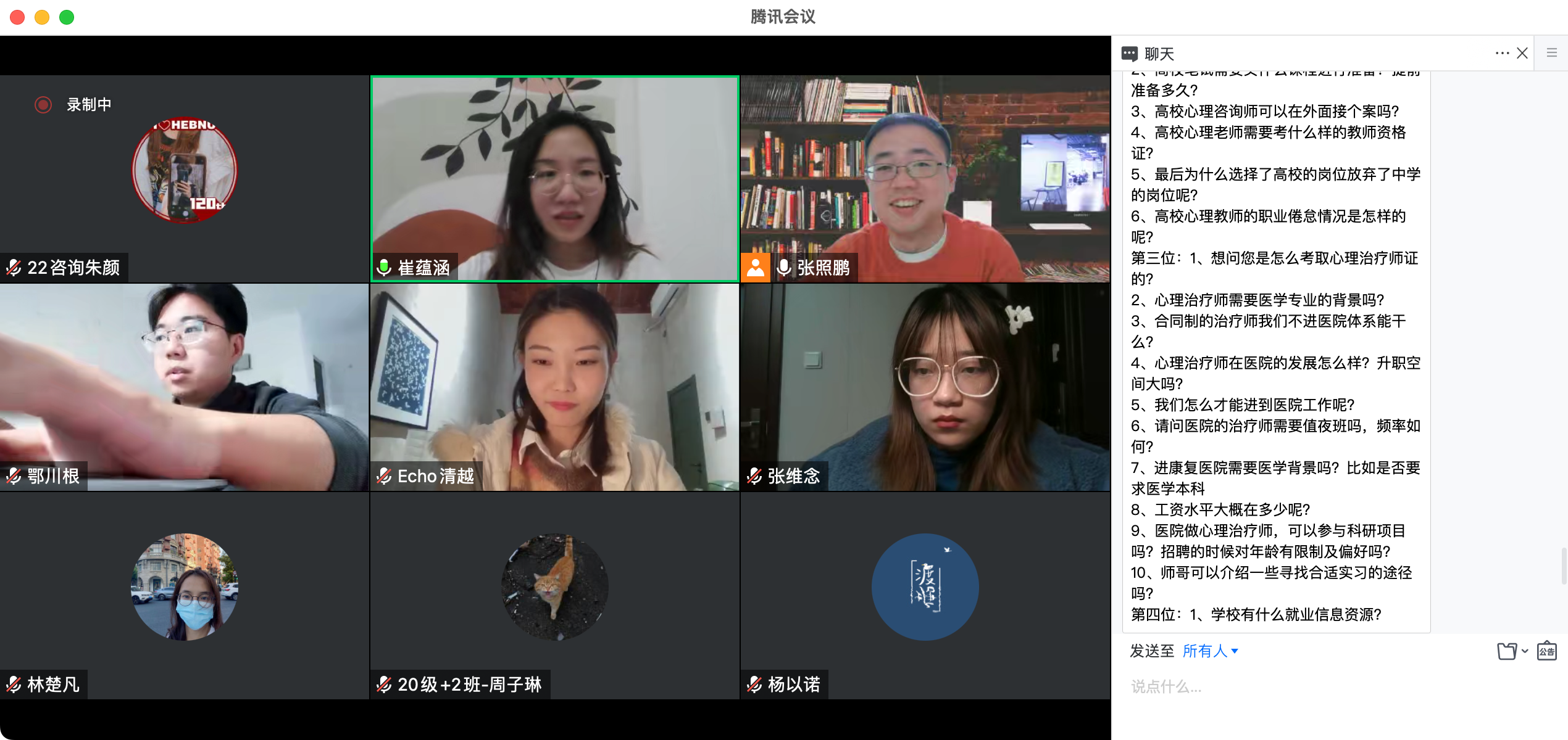 最后,宋清越同学的分享围绕个人执业和高校兼职心理咨询的工作情况展开,首先对自己面试简单心理等心理咨询平台的面试过程和心路历程,给予同学们很多经验,其次对在高校兼职心理咨询师的经历和感受,要自己平衡好自己的需求和时间,最后分享了全天咨询的感受,让同学们切实感受到个人执业心理咨询师一天的忙碌,同时根据自己的经验给想要个人执业的同学们提出了建议。