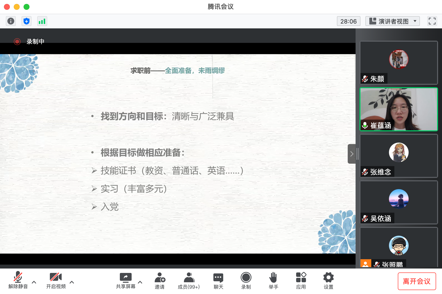 首先,张维念同学分享了自己的学习经历和在中小学的工作经验。她先是讲述了自己本科、研究生的经历,根据自己的兴趣学习自己想学的课程和内容,并且在研究生阶段将专业成长和个人成长相结合;其次给大家介绍了自己目前在中小学心理教师岗位的工作内容,包含临床实务、危机干预、教师培训、家校合作、建立学校心理工作体系等;之后根据工作经历分享了自身的感想,讲述了咨询专业在中小学任职心理教师的优势,以及工作中可能会存在的困扰;最后建议同学们多尝试多体验,寻求支持资源,提前了解就业需求相关信息等。