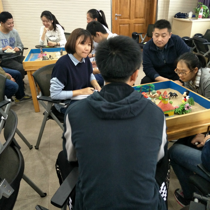 上午的活动主题是“释放真我——沙盘里的自己和他人”。活动开始后,大家进行了自我介绍、交流了参加活动的期待。在建立了初步的联结后,带导老师通过“我钟爱的沙具”和“团体沙盘体验”两个活动让大家循序渐进地探索自己。 第一个活动是“我钟爱的沙具”。带导老师邀请全体参与者用三分钟自由尝试用手触碰沙子,和沙盘进行初步的亲密接触,并从所有沙具中挑选一件自己一见钟情的小物件,在室内任意位置进行摆放,然后随意走动,看到其他人的沙具有什么感悟,就写在精美的贴纸上,留在沙具的旁边作为礼物送给对方。事后大家主动分享自己挑选沙具的初衷和收取到他人礼物后的心情:有对同一物件共同感受的惊喜、开心、被理解;也有差别迥异带来的意外、沉思、被开启。
