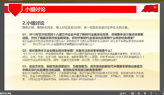 谢思琪指出:二十届三中全会通过的《决定》中,有许多改革举措对普通民众的生活会产生重要影响,例如完善收入分配制度、提高社会保障的覆盖范围和保障水平等。以宁波市为例,当地通过基本公共服务制度体系改革,将很多小区里闲置的仓库、小区边的商铺、写字楼里的空间挖掘出来,变成了共享健身房、共享礼堂、共享书吧、共享花园等,近700个小区都得到改造提升,增强了基本公共服务的均衡性和可及性。其他两组的代表也就问题分享了小组的讨论与体会。 至此,本次专题学习活动圆满结束。