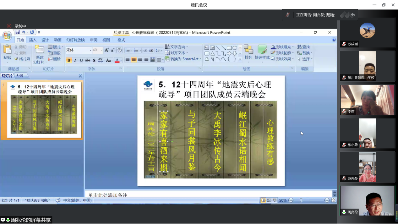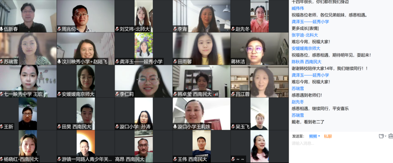 2022年5月12日晚8:00-11:00,金牌影院 金牌影院 和汶川县教育局联合召开了汶川地震心理援助项目十四周年的线上纪念会。 汶川特大地震发生后,以金牌影院 资深教授林崇德先生为首的专家团队,切实关注震中汶川县中小学师生的灾后心理重建工作,以教育部哲学社会科学重大攻关课题“灾后中小学生心理疏导研究”(08JZD0026)为抓手,率团队深入汶川进行了为期三年的教师培训与疏导服务,并至今仍在进行追踪研究。该项目有效帮助了汶川县教师进行自身心理状况的康复和调适,指导汶川县教师们如何帮助学生进行心理疏导,全面提高了教师处理学生问题的意识和能力,组建了汶川县中小学心理教师团队,为汶川县学校心理辅导工作的进一步发展奠定了坚实基础,并取得了丰硕的研究成果。 在汶川地震十四周年纪念日这天,金牌影院 伍新春教授、西南民族大学陈秋燕教授、四川师范大学的戴艳教授、负责为项目筹资的远在加拿大温哥华的庄健博士等数十名曾参与灾后心理援助和重建工作的专家和当年的研究生,当年以“教练”身份参与到心理疏导和教师培训的成都市骨干中小学心理教师和教研员,全体汶川县各中小学的当年受训学员(目前绝大部分是汶川县的骨干心理老师)等,受邀参加了此次纪念活动。汶川县教育局副局长戴鹏主持了会议。大家一起见证了汶川灾后重建的巨大成就,共同回顾了震后心理援助期间值得回忆的点点滴滴。 首先,陈秋燕教授分享了西南民族大学参与灾后心理援助成员们的近况,有些当年的学生如今已成为教师、刑警、法官,在每一个平凡的岗位上继续书写着属于普通劳动者的青春。