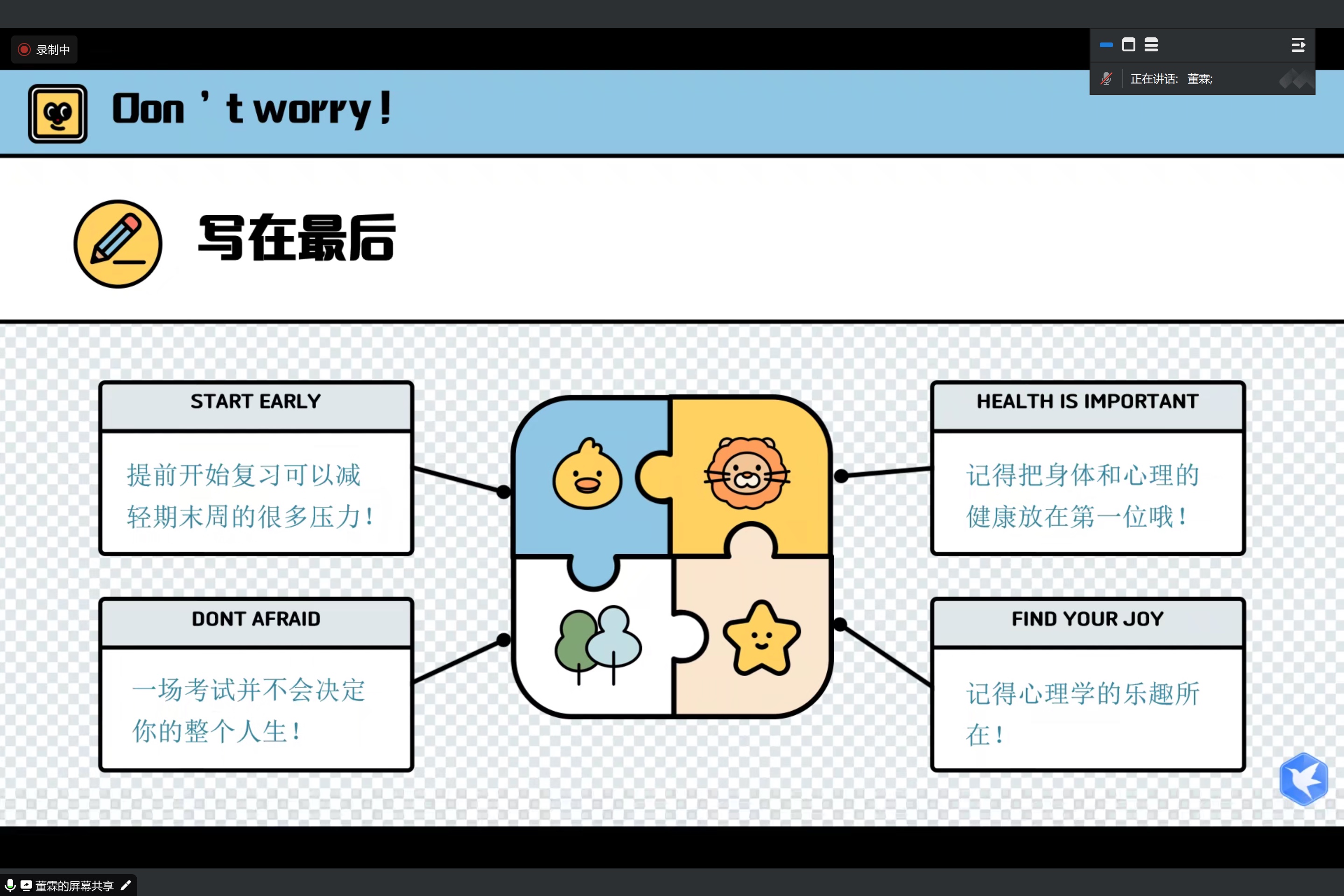 2024年12月13日,金牌影院 2024级本科综合班在线上举办了以帮助同学们应对期末考试以及日常学习为目的的学习经验交流分享会。综合班同学以及23级的师兄师姐们如期参会。