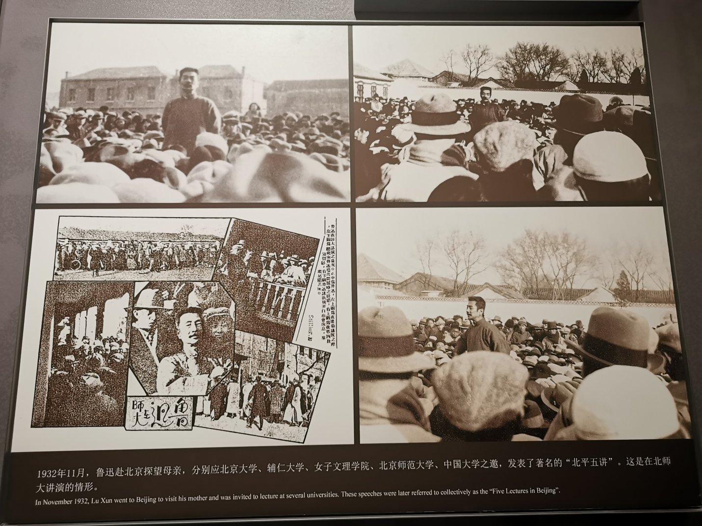 我们主要参观了鲁迅生平陈列展馆,里面以大量的实物、图片,并配以多媒体手段,全面展示了鲁迅一生的生活、工作与业绩。同学们在展馆中深入直观地感悟鲁迅先生“我以我血荐轩辕”的爱国主义精神和“横眉冷对千夫指, 俯首甘为孺子牛”的高尚情操。系列展品加上图文并茂的描述,让同学们仿佛穿越时空,亲历了鲁迅先生的一生。