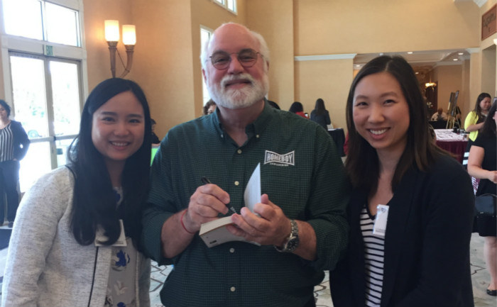 比如,美国的天宝.葛兰汀(Temple Grandin), 她两岁被诊断出自闭症,直到四岁才开始说话。虽然先天与众不同甚至被别人误解为怪人,但她一直朝着自己感兴趣的方向发展。她在大学期间发明了拥抱机给过渡敏感的人使用来降低他们的压力,后来她又设计出了有效的牛只畜牧业设施来降低驱赶牛群的人力成本。葛兰汀于1989年取得了伊利诺伊大学动物学博士,目前任教于科罗拉多大学。感兴趣的朋友可以去Ted Talk上搜索她的演讲,非常有启发性。 图4 陈师韬老师和《心上的刺青》作者、著名的老葛神父--Greg Boyle 合影 L:如果建构一个比较理想的学校心理学体系,我们现在需要从什么开始做起?