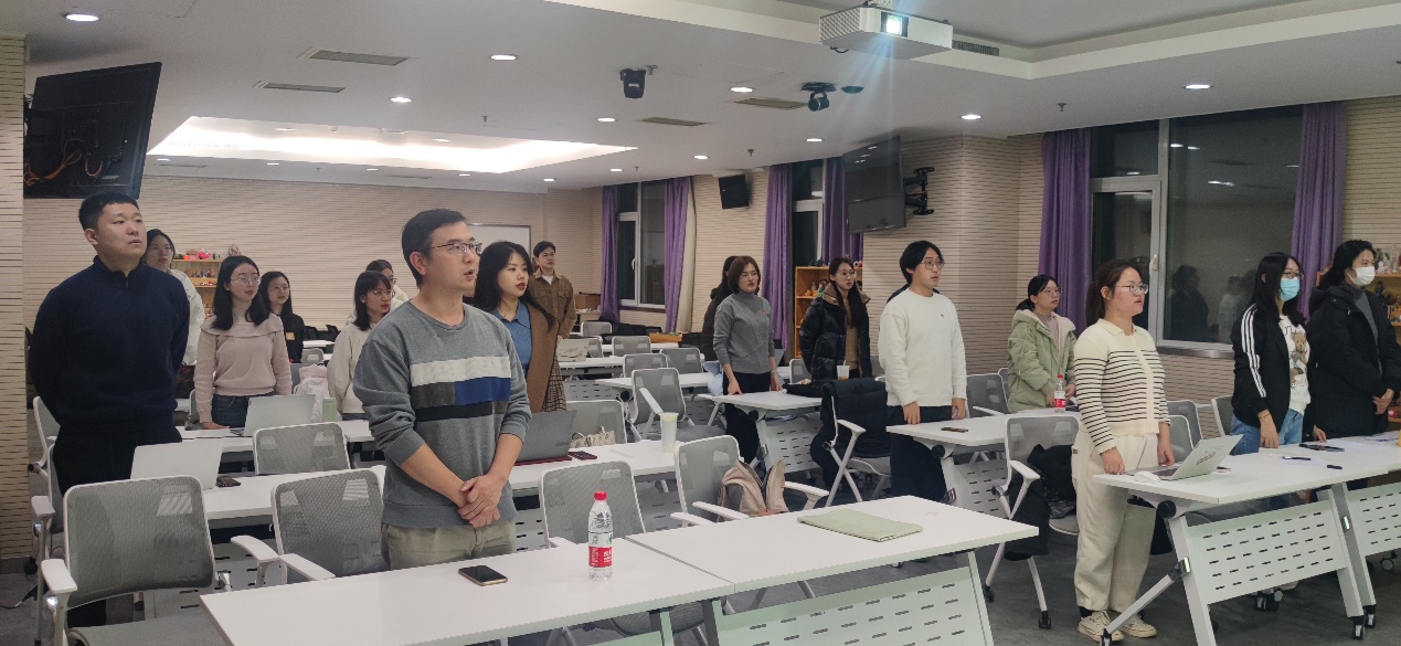 研究生第九党支部民主评议组织生活会在后主楼1318召开。会议由党支部书记李紫菲同志主持,党支部指导老师胡思源老师亲临现场。党支部20名党员同志以及积极分子同志们均前来参会,1名党员同志线上参会。 会议开始,党支部全体成员起立,合唱《国际歌》。