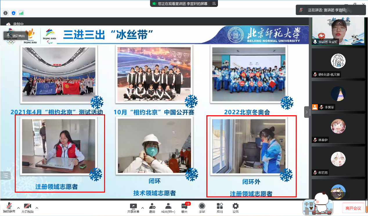 宣讲活动结束后,大家的热情不减,在群里分享了自己的感想。 周婧怡:宣讲团同学给我们介绍了很多幕后的故事,让我了解到了不同岗位精彩有趣的工作内容,也弥补了我没有能够亲身作为冬奥志愿者参与到这项盛事中的遗憾。在宣讲的过程中,我们看见了这次冬奥会与冬残奥会从宣传片、演出节目等的“软件”,到雪飞天、雪如意等“硬件措施”上处处体现了中国魅力、中国风采,处处彰显着文化自信。当然,我们的自信不仅仅来自于传统文化,从志愿者们的热情到运动员们的实力,从工作人员的专业与创意到体育场馆使用的高精尖技术,每一处都彰显着中国实力与中国自信。除了这些光鲜靓丽之外,我们也能看到各项活动、仪式圆满完成的背后,是工作人员们无数次演练、彩排、遇到突发状况的紧急处理,大家真的很不容易,都尽自己最大的努力,在自己的岗位上做到了最好。这些努力与奋斗,这些坚韧不拔、不到最后一刻绝不放弃的精神,才是中国自信最根本的来源。 张涵宇:今天的冬奥精神宣讲,几位同学从不同的方面向我们介绍了本届冬奥会和冬残奥会,不仅让我对于冬奥会的各类设置更加了解,还通过自身的工作、志愿服务经历的分享让我更加生动地看到北师大学子默默贡献的力量。尤其是开闭幕式的工作人员,明明是离演出最近的人,却因为忙于表演工作的筹备、组织等,而没有办法完整地看一次演出,这让我非常动容。是每一位完全地忘我、全然地奉献的幕后工作者,成就了这一次的冰雪盛会。 蒋欣颖:冬奥会宣讲团同学们今天给我们带来了很多冬奥会和残奥会的故事,将之前带了一层神秘面纱的志愿者工作栩栩如生地展现在我们面前,让我感受到其中的不易和勇往直前的精神,也感受到奥运精神的拼搏向上。在宣讲过程当中,从很多处的细节,都能感受到细节的作用,感受到对待每一个工作一丝不苟的精神。最令我印象深刻的是里面关于防疫的一句话,大概是对于个人而言,感染的风险可能增加;但是对于整个场馆感染的风险却是降低了。这种以众任为己任的精神,令人感动,也感到佩服。这种精神和信仰,值得我好好学习,好好提醒自己,在未来道路上,要有全局观,要有为他人分担,为社会贡献出自己力量的信念! 陈作为:为冬奥together的精神感到振奋,也为志愿者舍我其谁进入闭环而感动。听到志愿者和外国运动员、技术员的友好来往,听到外国人会跟我们的志愿者说出一句句不熟练的“谢谢”,让我又相信了人与人之间的美好了。冬奥会能办得这么顺利,这么成功,背后是无数志愿者无怨无悔的付出,为他们点赞! 刘津均:今天的宣讲有一些冬奥会的小知识和很多幕后工作人员的工作内容,让我们再一次回顾了简约、安全、精彩的奥运盛会。这精彩是我们的骄傲,其中必然离不开祖国的强大,也离不开广大青年同志的艰苦而又热情的工作。在这次的宣讲中最让我印象深刻的是我们的同学们在工作中展现出的奉献精神和对细节的注重。给这些师大学子点赞,也向他们学习。 陈素素:今天的冬奥主题宣讲活动给我们提供了细致了解冬奥会、冬残奥会的机会,通过本次宣讲,我温习了我国举办奥运的先进理念和长久准备,细致地了解了多个岗位志愿者的工作感想与部分工作过程。这让我体会到了小小个体和庞大盛事的紧密相连,也让我产生了些微没能去当志愿者的遗憾。 柏霁容:今天的宣讲以冬奥会残奥会的吉祥物、会徽等开始,以志愿者们的分享结束,深刻让人感觉到这是一场人类体育盛会。在志愿者们的分享中,我们不仅能看到冬奥会各种细节之处,也能体会到冬奥会以人为本的精神,更让人感动的是志愿者们在热爱与付出的过程中也实现了自我成长。为志愿者们点赞,也为奥运健儿们点赞,更为所有幕后人员点赞。 王淏蘭:今天听冬奥会宣讲团成员们的讲座,让我更直观地了解到了志愿工作的不易。其实自己之前也有想申请冬奥志愿者的想法,但由于种种原因还是退缩了。今天听到他们的故事,让我觉得太佩服了,志愿者们在荣耀的背后付出的时间和努力也都是巨大的!正是这些优秀的幕后工作人员才能让北京冬奥在全球疫情如此紧张的时刻,无比顺利地举办!被他们的奉献精神所感动,为他们细致入微的工作点赞! 柳开纯:从宣讲学到了一些奥运会背后的知识,还有志愿者服务的故事,不过,最让我感兴趣的是我们国家冬奥会场馆的设计理念,历来冬奥会场馆的后续利用都是一个重要的问题,历史上各国有很多的奥运场馆在赛后就被废弃,或是因为地理位置偏僻,或是因为维护费用太高等,比如2017年巴西里约热内卢的大部分奥运场馆都停止使用,1984年萨拉热窝的废弃颁奖台。后来申奥也将这一项纳入,而我们国家的场馆无疑是绿色、可持续的,这点就觉得非常好。 金欣园:听了这次冬奥会志愿分享感想颇多,在空余的假期,我期望我能为国家疫情期间为冬奥等事情尽自身全力。这不仅仅是锻炼自我,也是锻炼自己应该有服务社会的意识。往后的日子里凡是体现自我价值服务社会的义务活动我都会尽全力去做,为社会献一份自己的力量。 蔡旻旻:今天的宣讲中,我不仅了解了一些冬奥相关的设计理念,冬奥的精神,更多的是听到了志愿者们细节丰富的志愿故事,这些细节让我觉得离冬奥更近。它不再只是视频里的画面,奖牌榜上的荣耀,而是由大家的坚持和努力汇集而