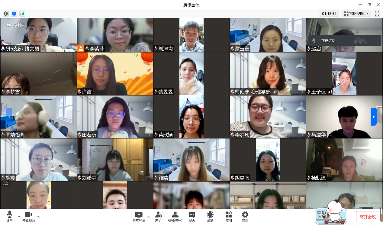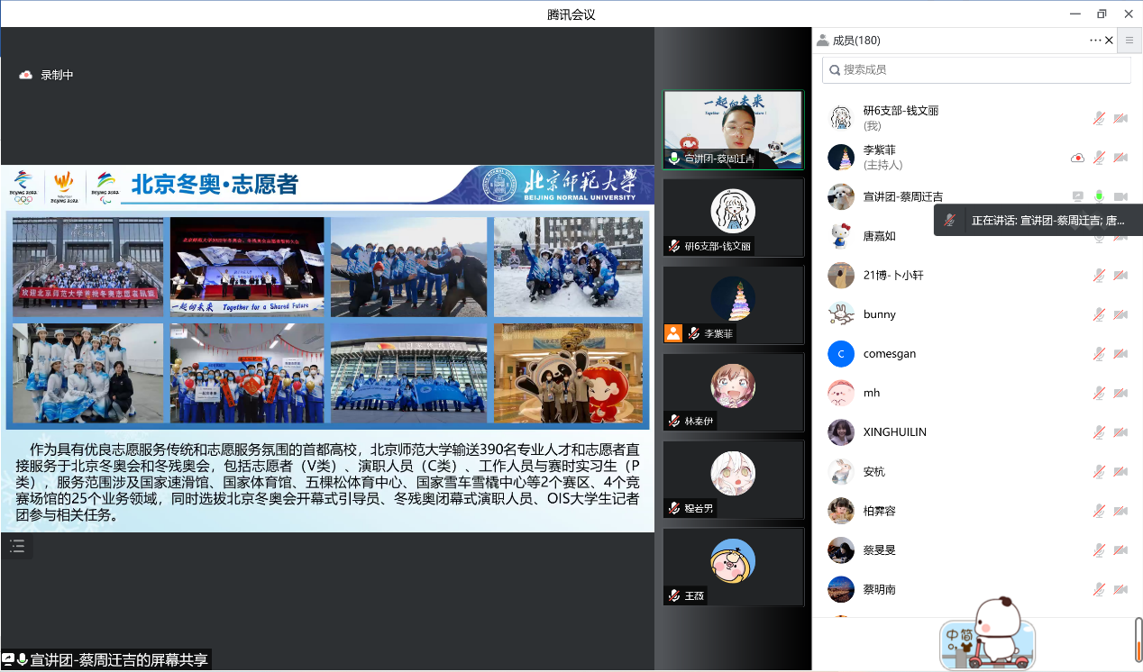 2022年4月22日晚19点,金牌影院 研究生第六党支部联合研究生第二、三、四、五、七、八、九、十五、十七、二十二党支部,2020级学硕2班团支部和2021级专硕咨询第一团支部共同开展“冬奥盛事,青春有我”主题宣讲活动。在党支书李紫菲的主持下,1位微课主讲人和3位宣讲员分别分享了冬奥知识和自己的冬奥志愿者经历。此次活动参与者众多,约180名党员及入党积极分子在线共同聆听学习。